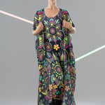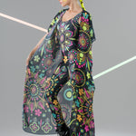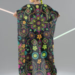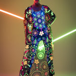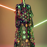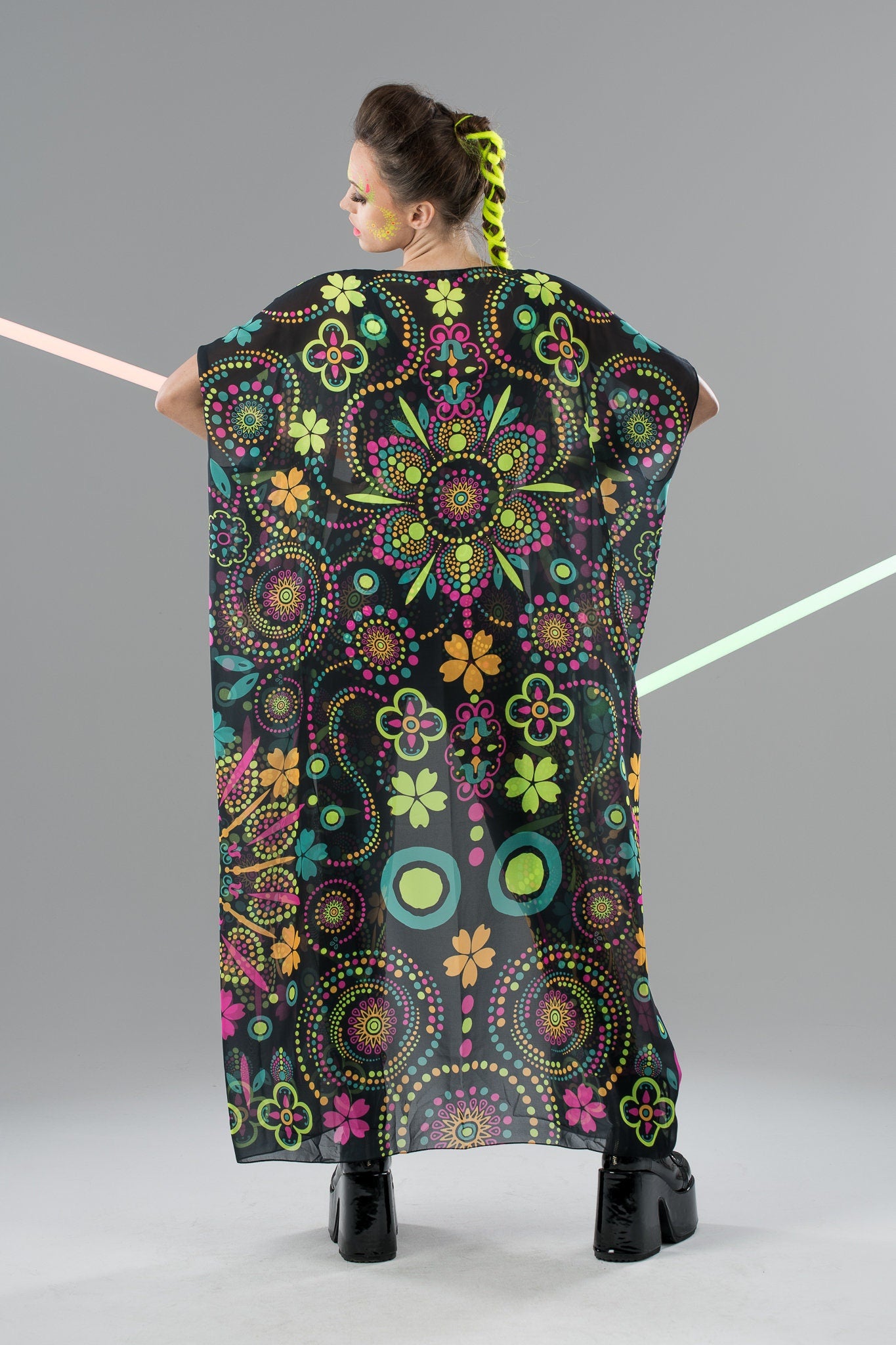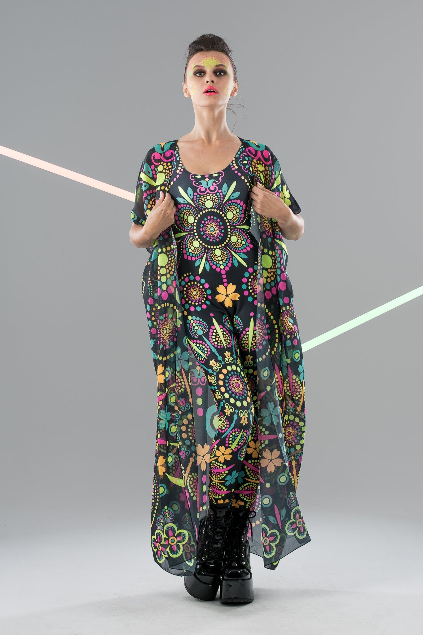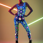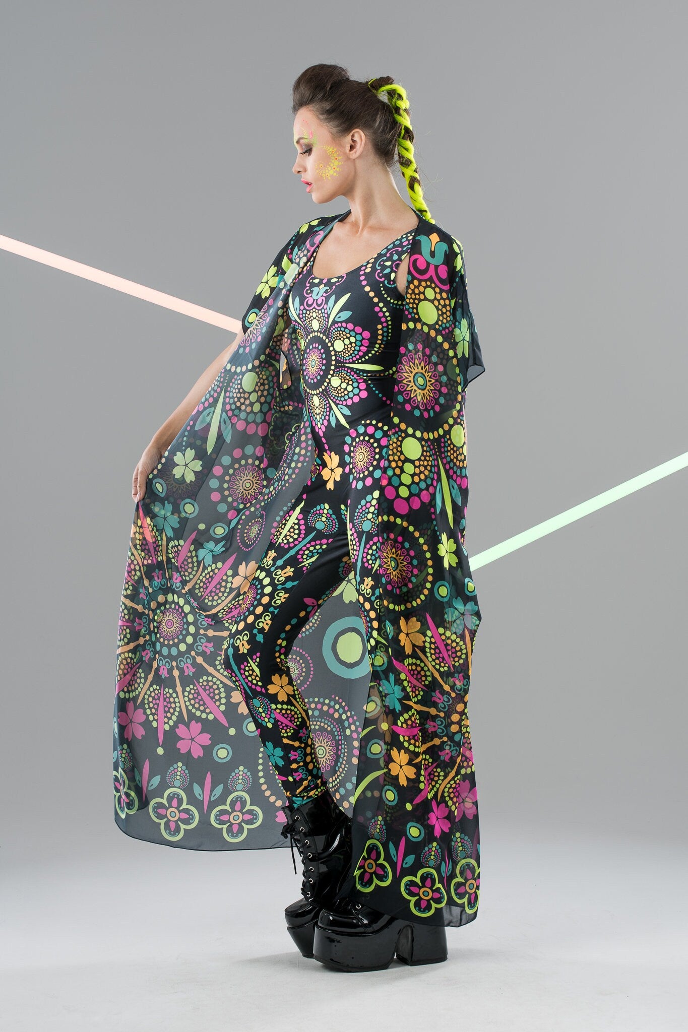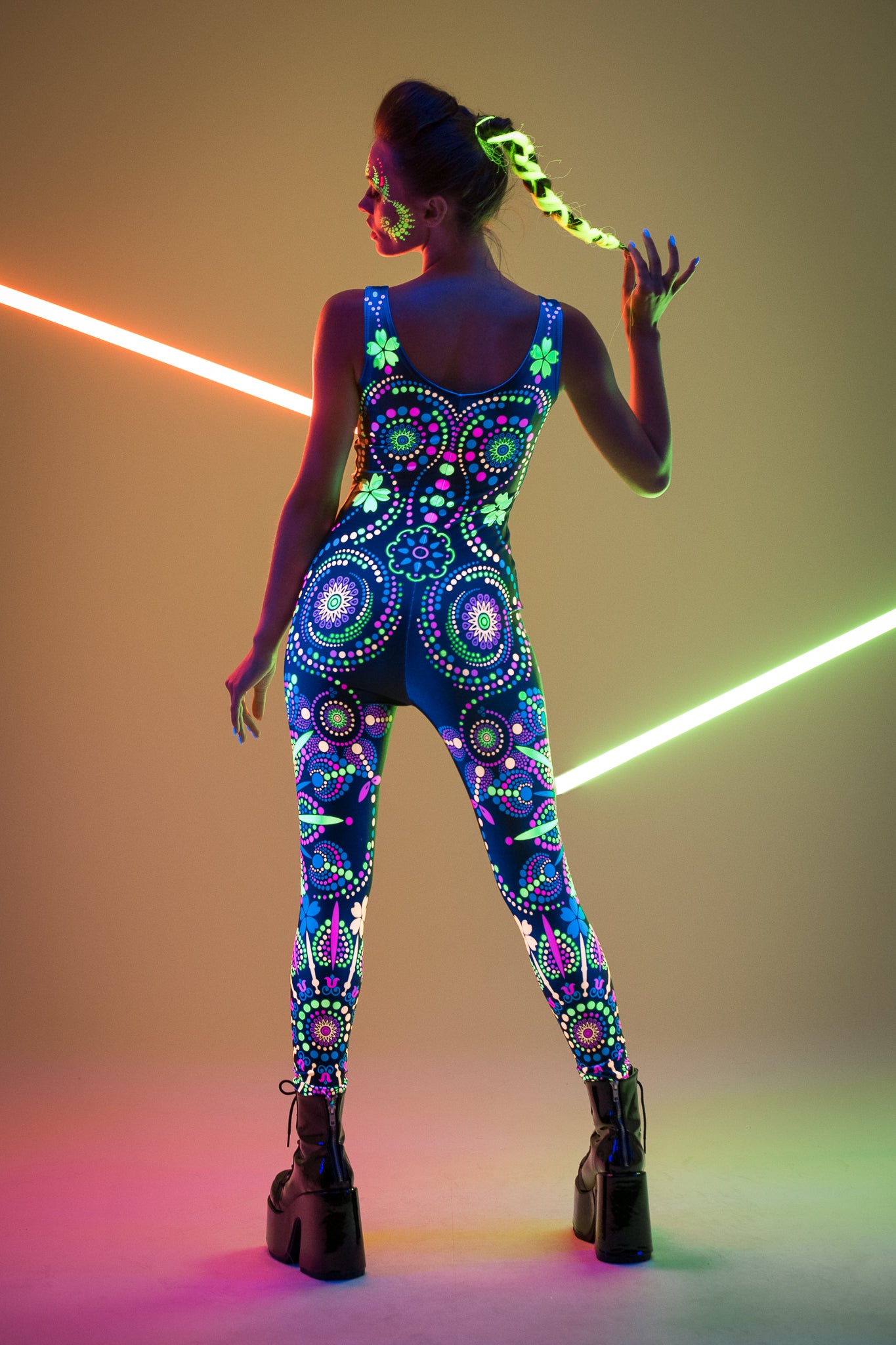One-piece MANDALA UV REACTIVE jumpsuit with a captivating neckline and an exceptionally distinctive neon boho design. Choose the outfit that will attract attention & hypnotize everyone around you!