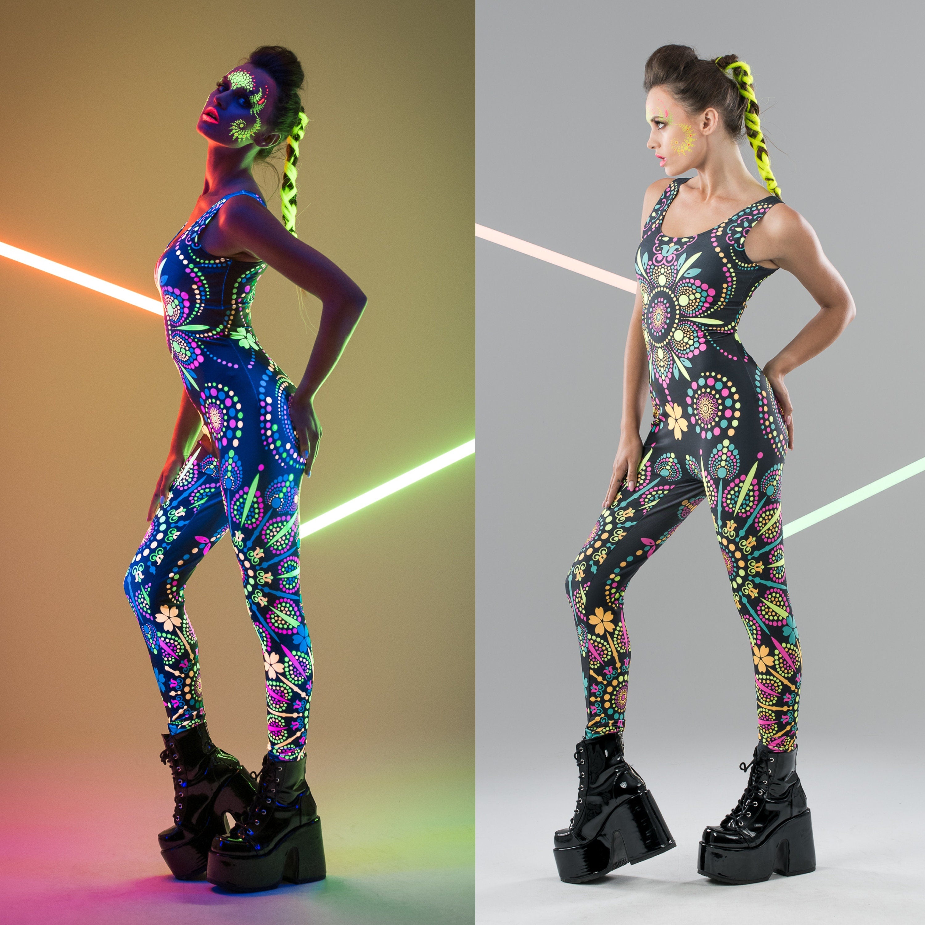 One-piece MANDALA UV REACTIVE jumpsuit with a captivating neckline and an exceptionally distinctive neon boho design. Choose the outfit that will attract attention & hypnotize everyone around you!