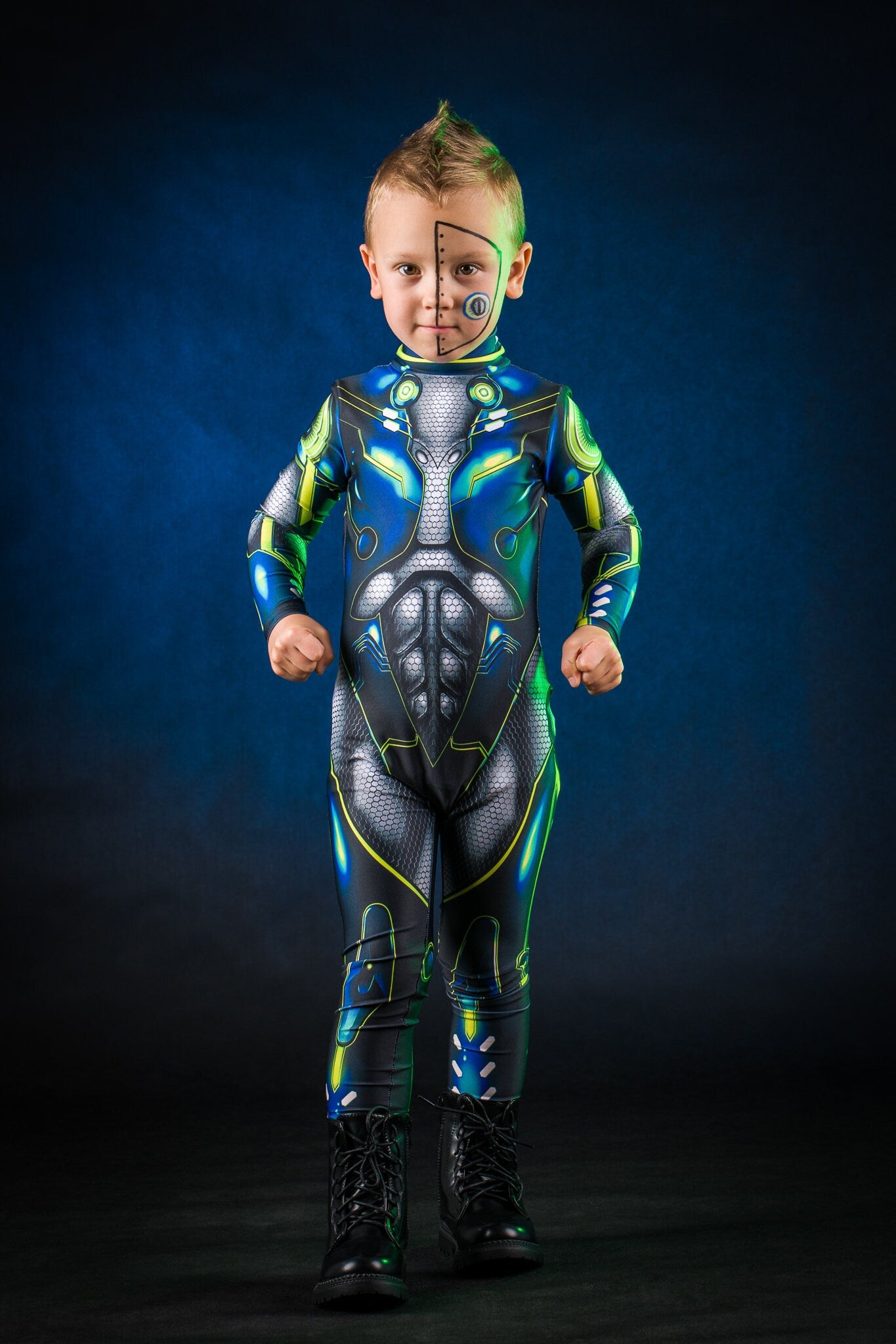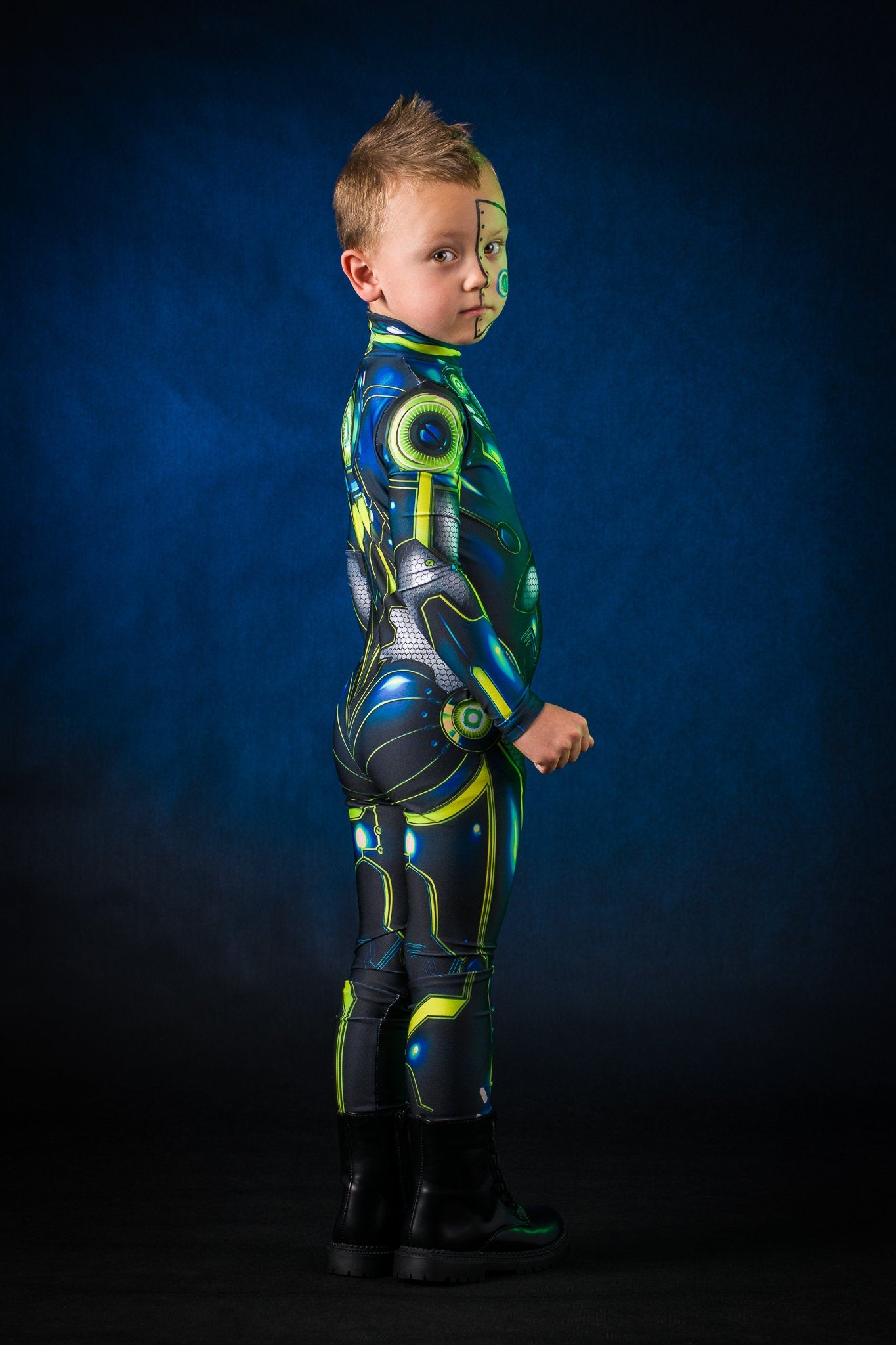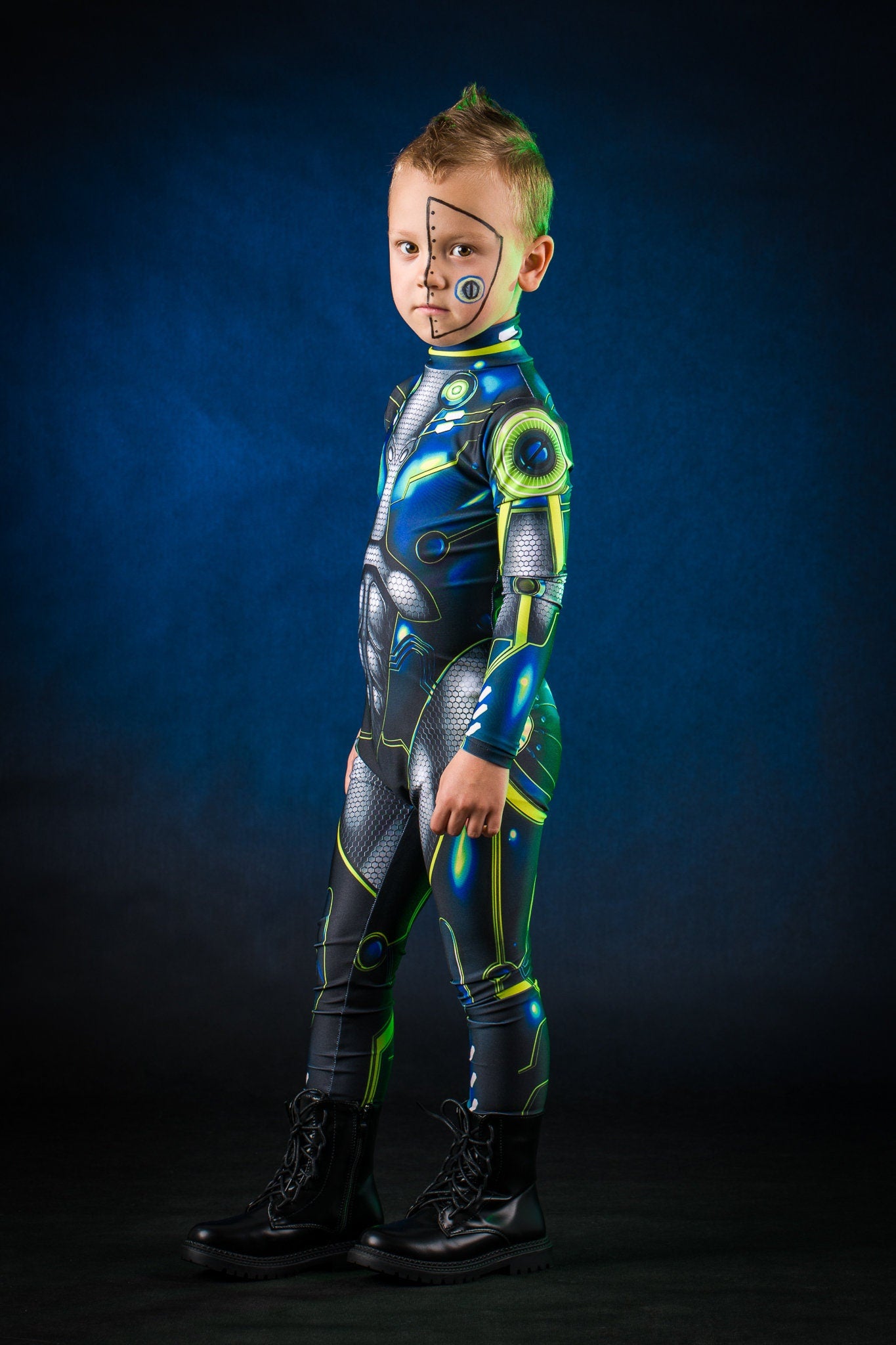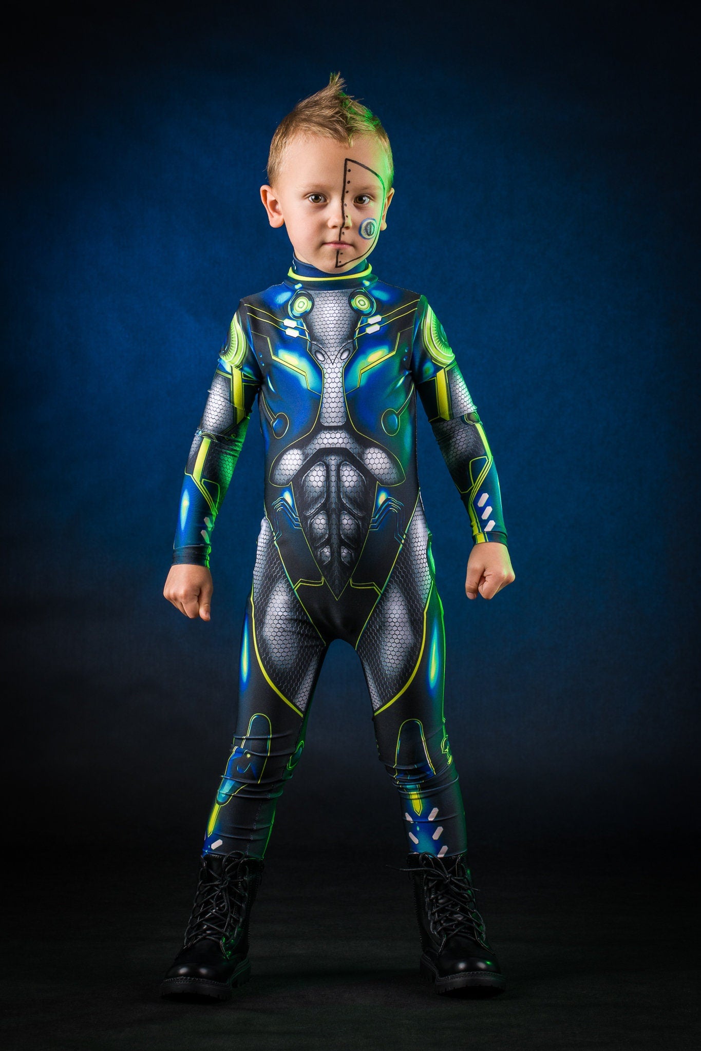 Let your child stand out from the crowd! A one-of-a-kind, artist-designed outfit inspired by cyberpunk style — full of futuristic details and bold visual flair. Perfect for dress-up, Halloween, or imaginative play. ⚡✨