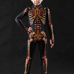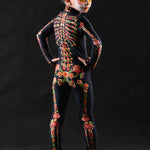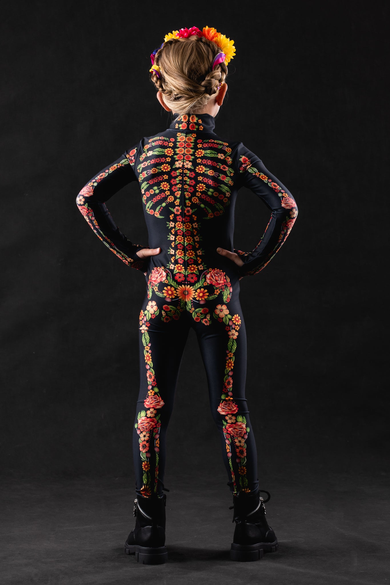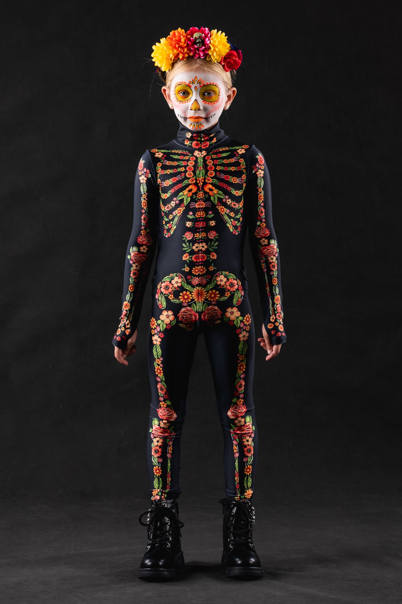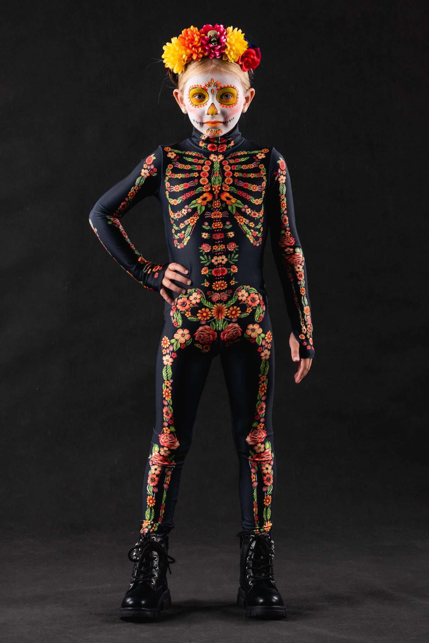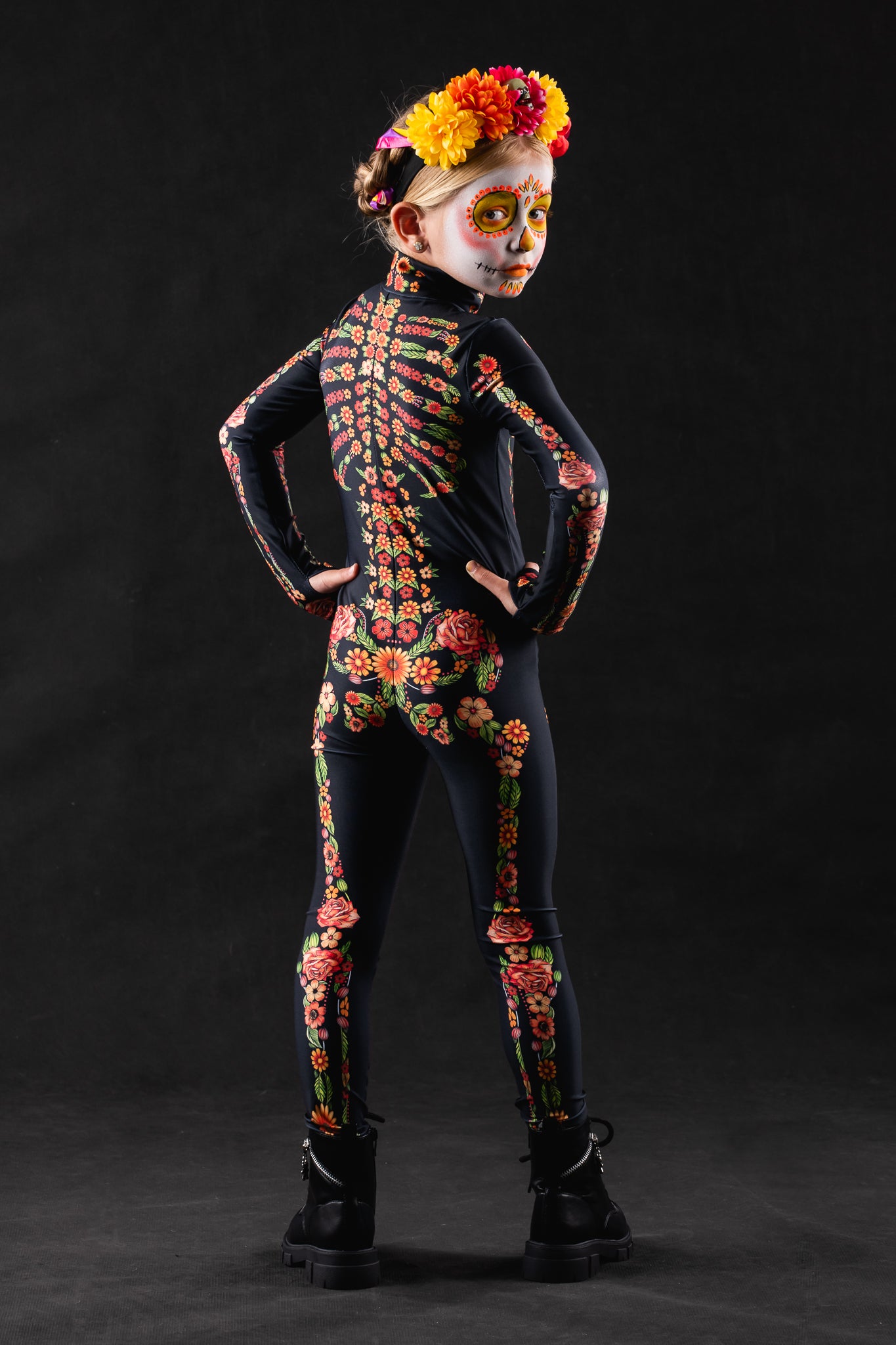 Let your little one shine this Halloween! This comfy and striking catsuit features a playful skeleton design made entirely of beautiful yellow and orange flowers – the perfect combination of spooky and sweet. Ideal for dress-up fun, trick-or-treating, and Halloween adventures! 🎃