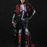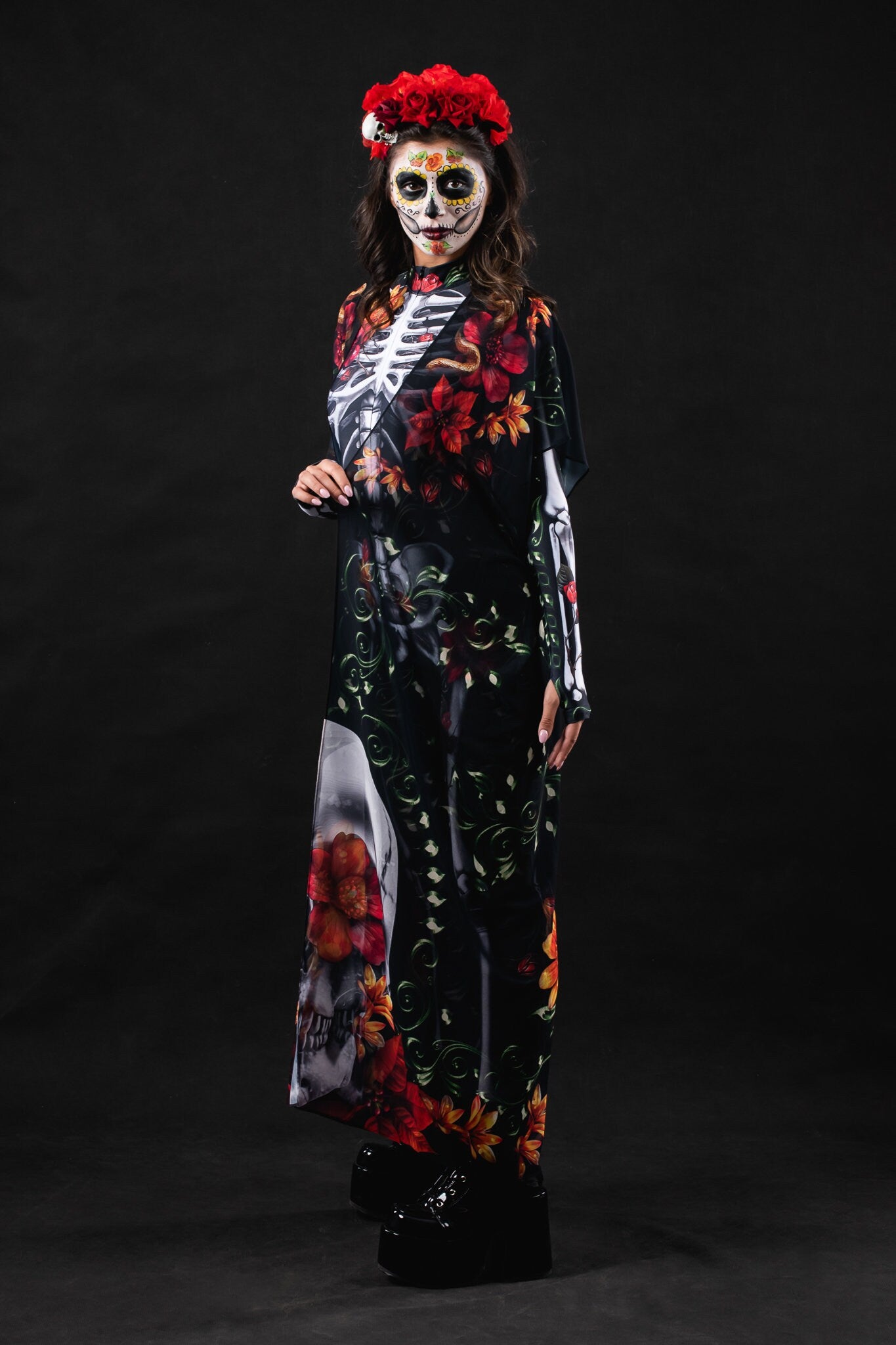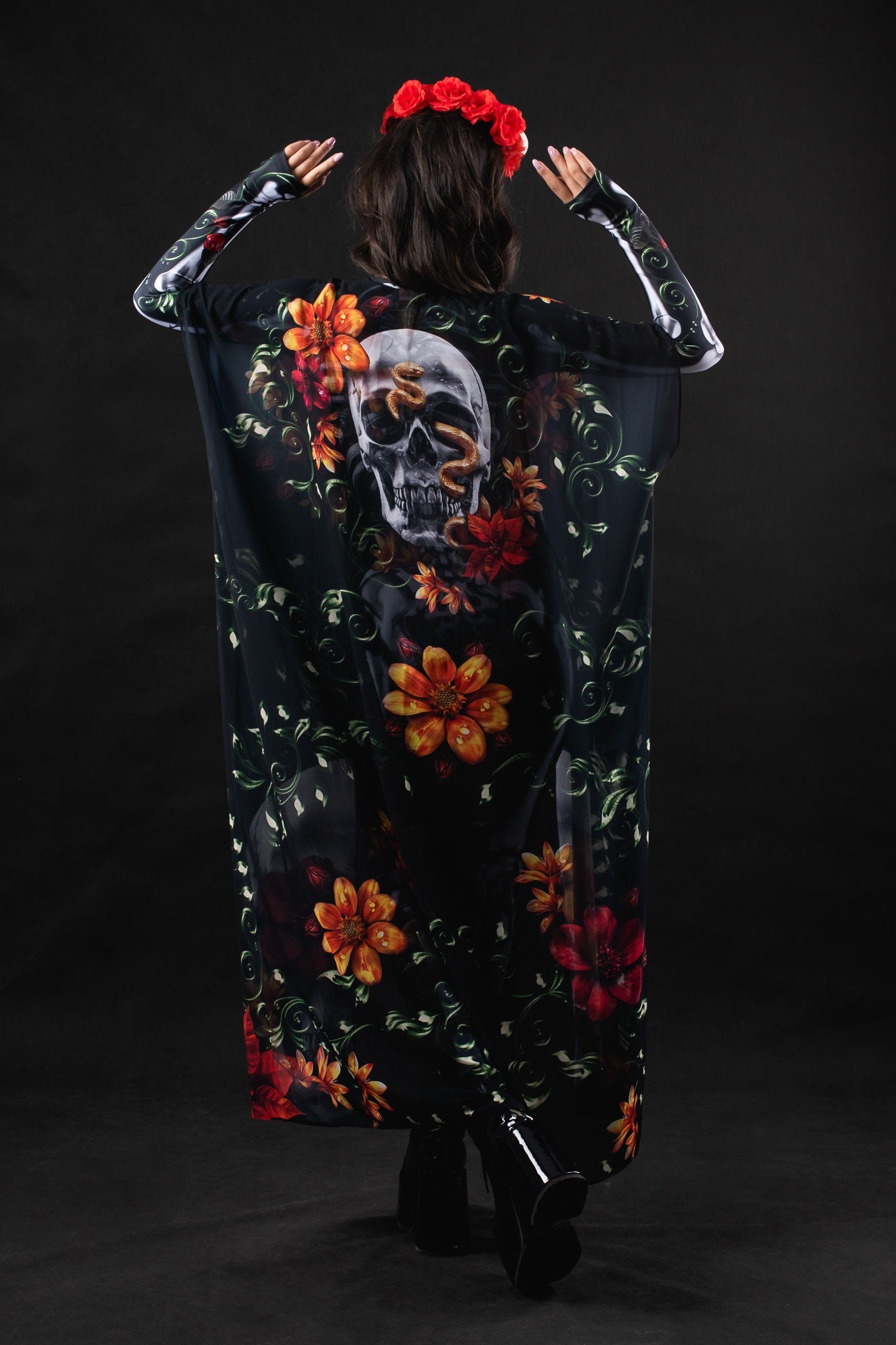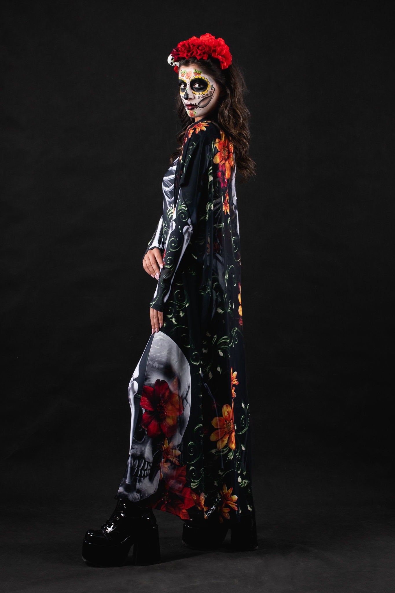 GREEN ORNAMENTS Halloween Kimono, Halloween Cape, Los Muertos Spectacular Cape, Clothing set with Cape, Skull and Flowers Hallowen Outfit