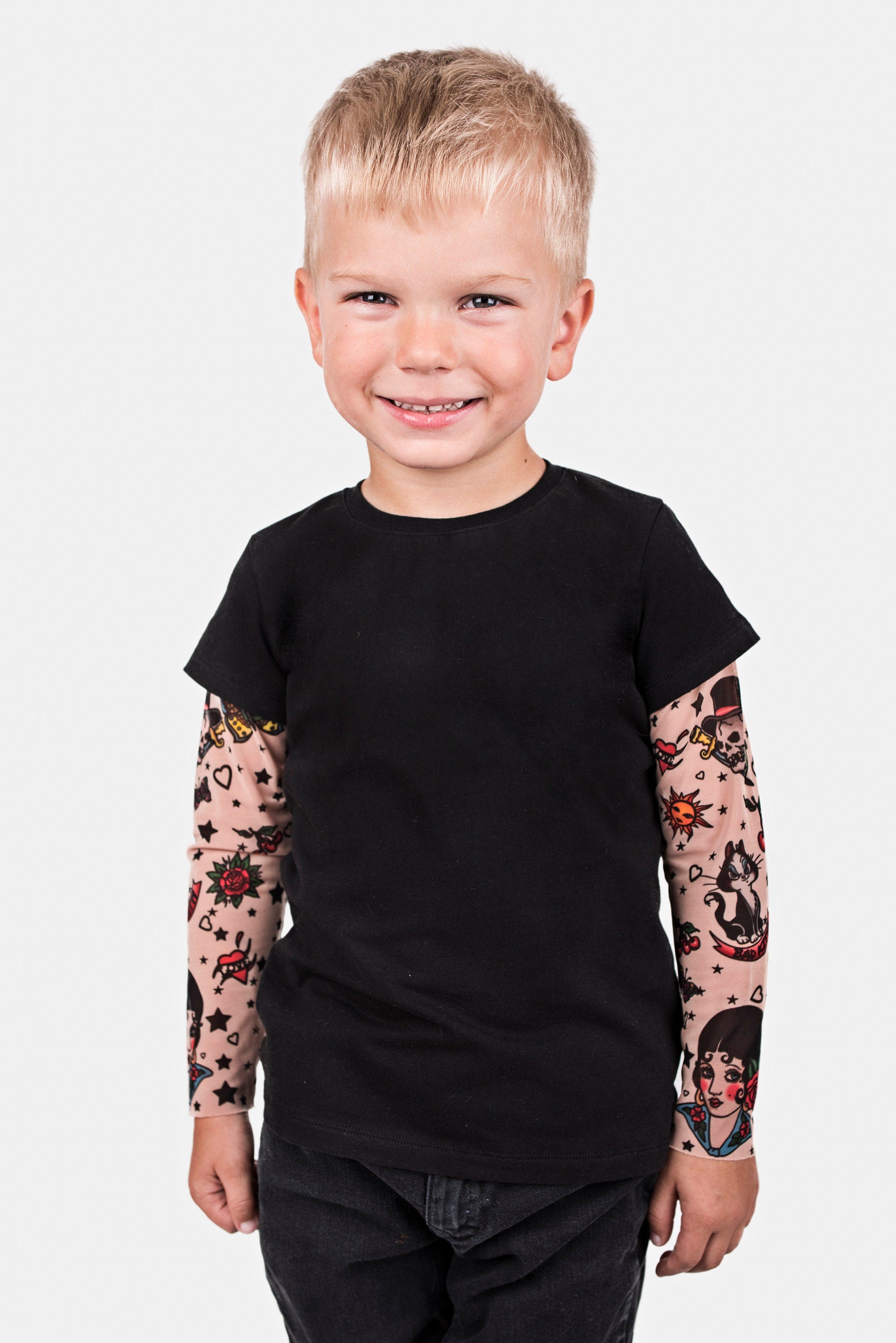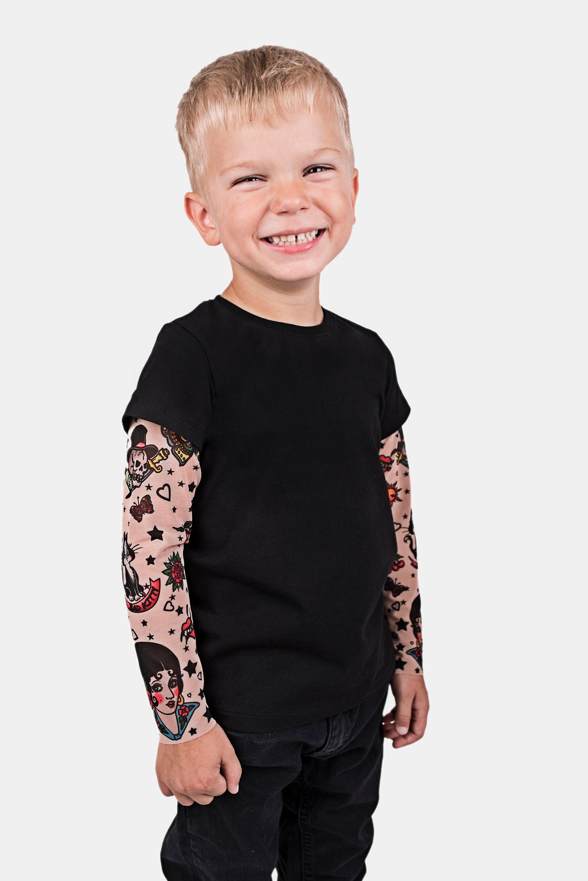 Looking for a unique outfit that adds some original flair to your little one’s style? This t-shirt combines comfort with an eye-catching design, creating a fun tattoo illusion on the sleeves! 😍