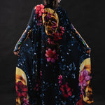 Mysterious, vibrant, and captivating – this kimono features a stunning print with Mexican skulls and red monarch butterflies blending the spirit of Día de los Muertos with a touch of Halloween allure.