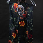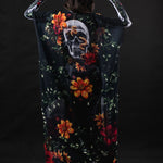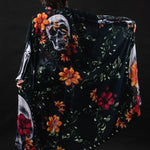 Mysterious, vibrant, and captivating – this kimono features a stunning print with Mexican skulls and red monarch butterflies blending the spirit of Día de los Muertos with a touch of Halloween allure.