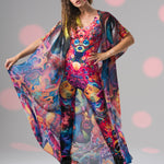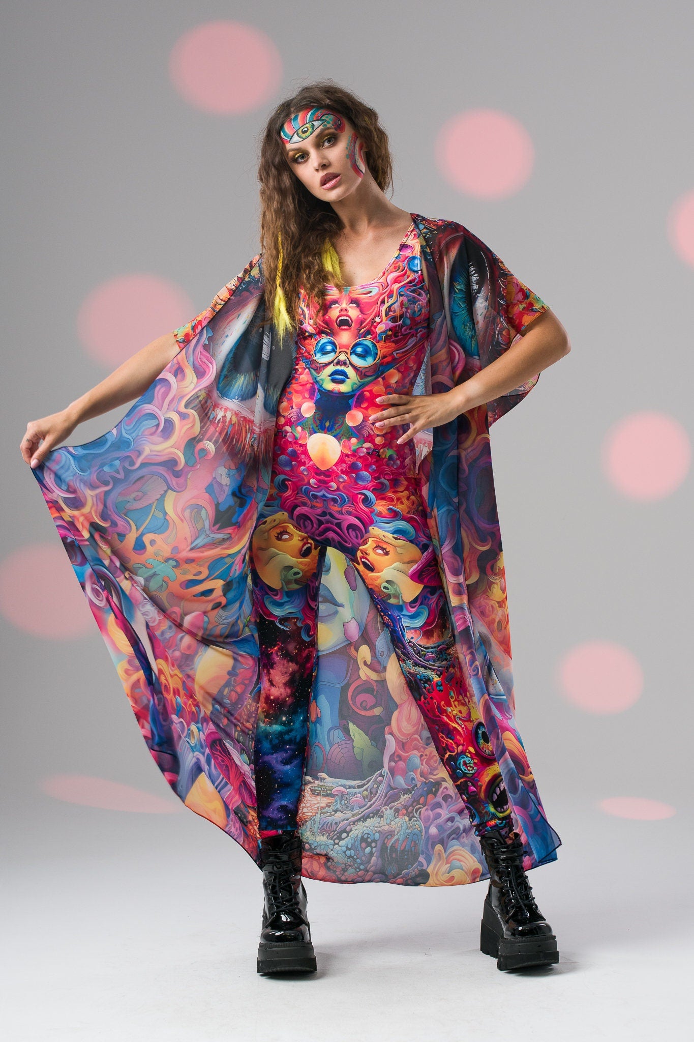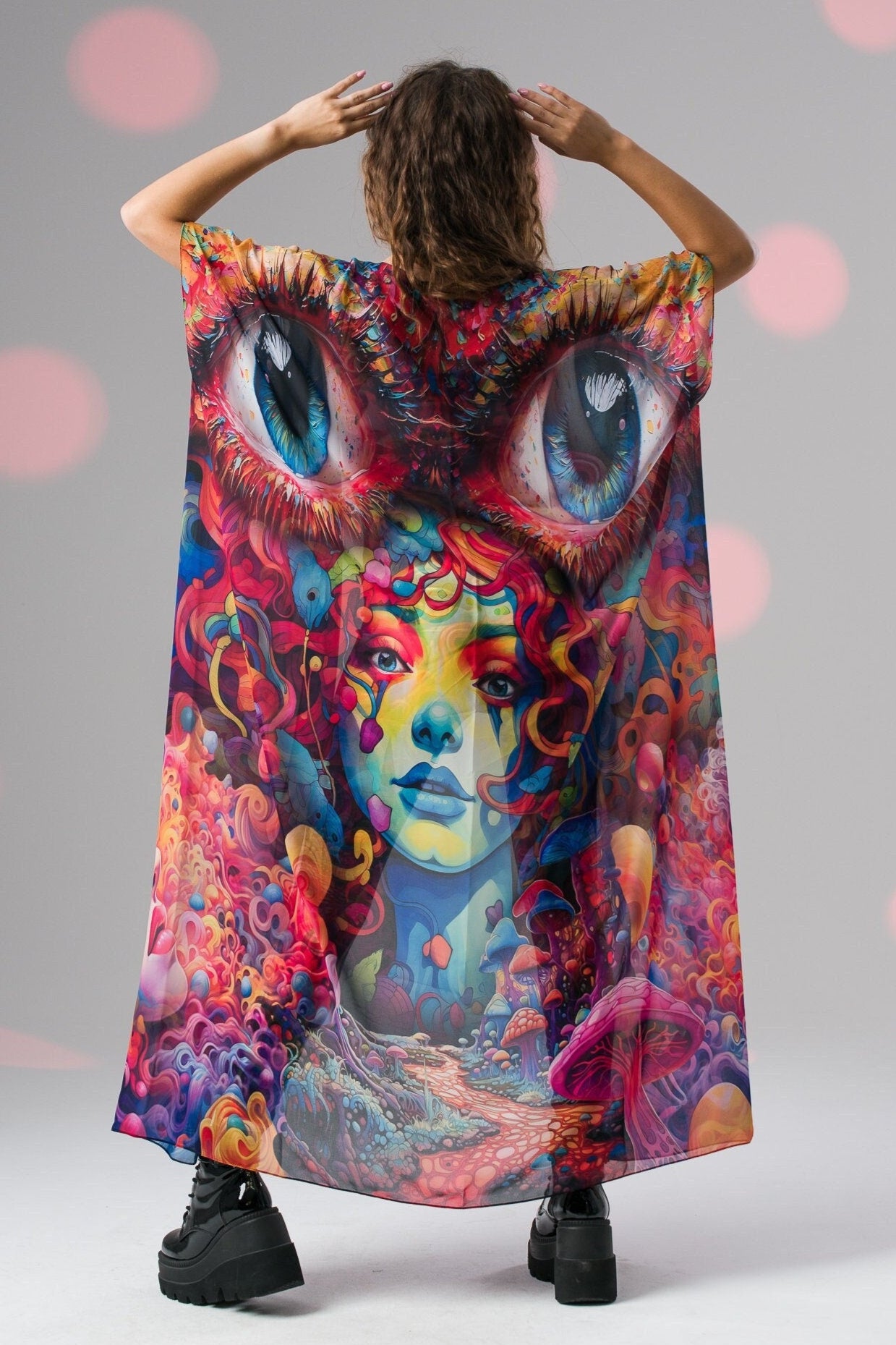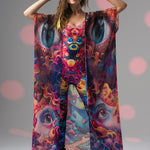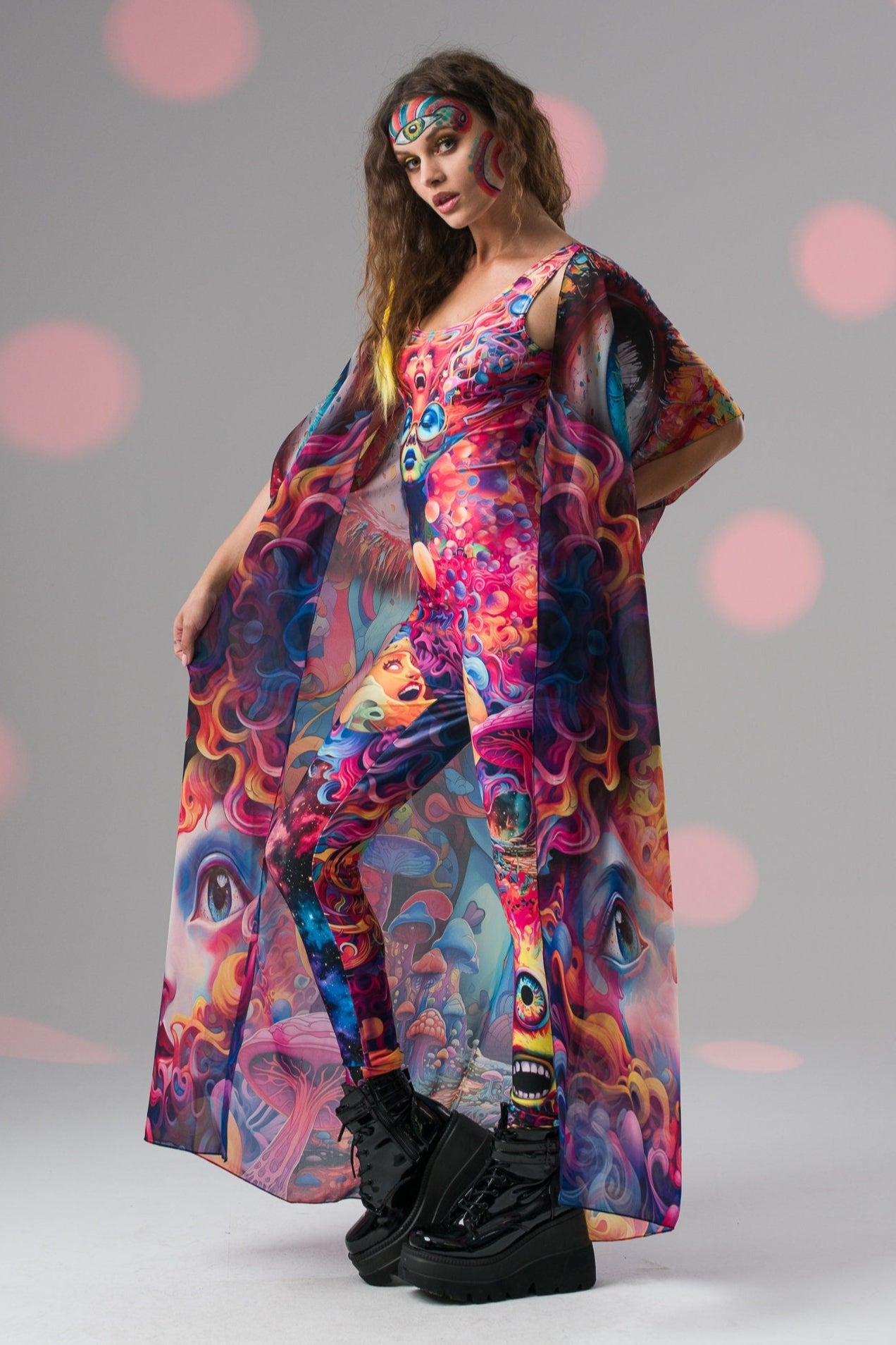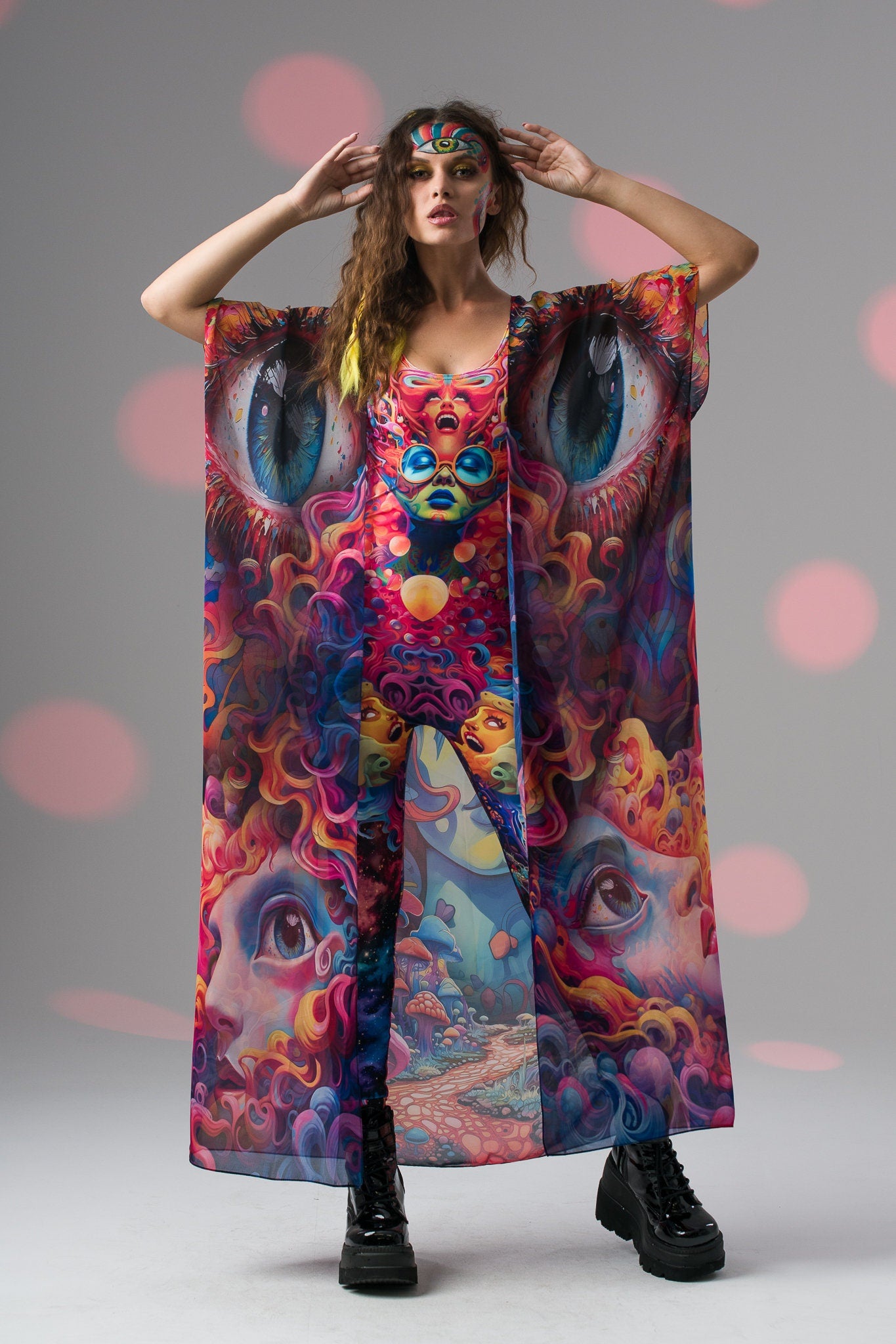 Light, flowy, and designed to mesmerize – this vibrant kimono turns every outfit into a work of art. Made from ultra-soft chiffon and covered in a bold, surreal print, it’s your go-to piece for festivals, performances, or days when you want to feel truly unforgettable.