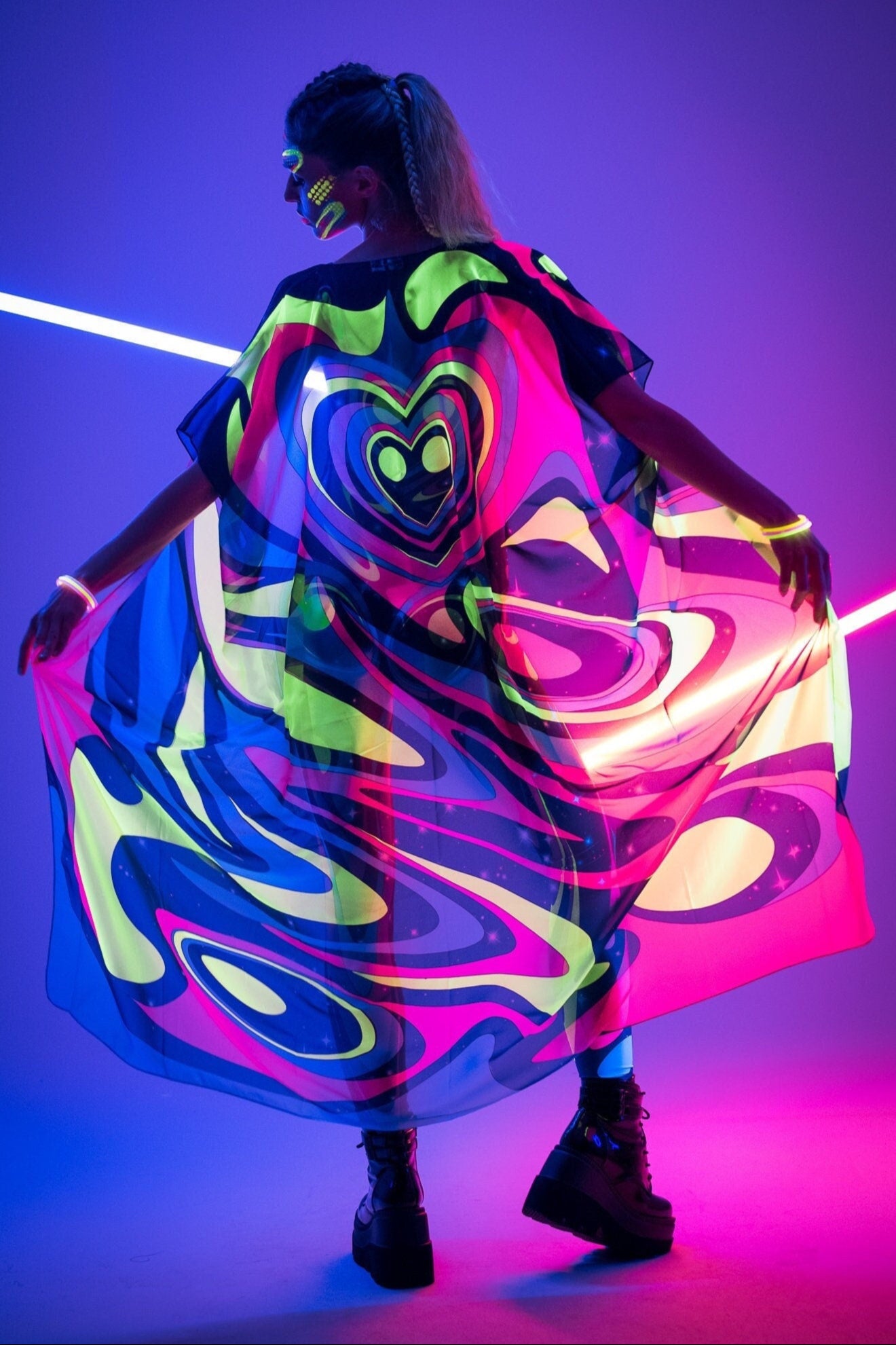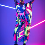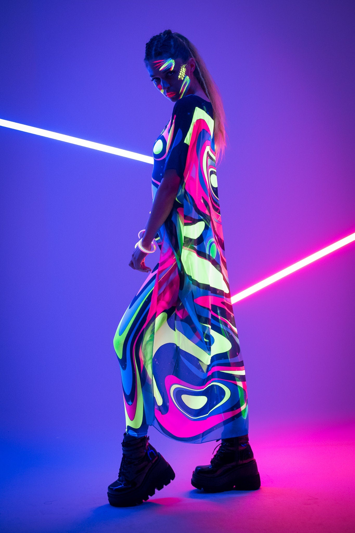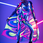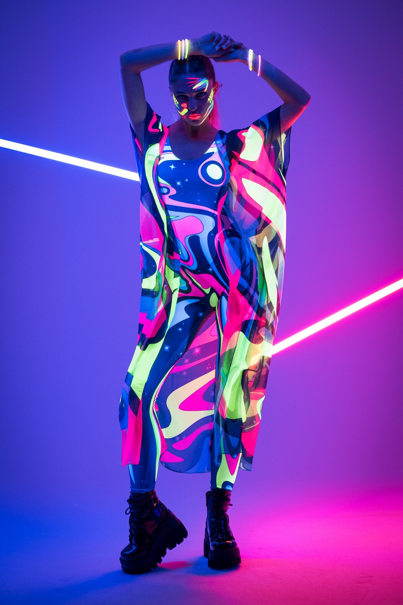 Light, flowy, and impossible to ignore – this UV-reactive kimono is your go-to for bold, glowing looks that stand out in any crowd. Crafted from ultra-soft chiffon and finished with a vivid fluorescent print, it's the perfect layering piece for parties, festivals, or performances.