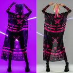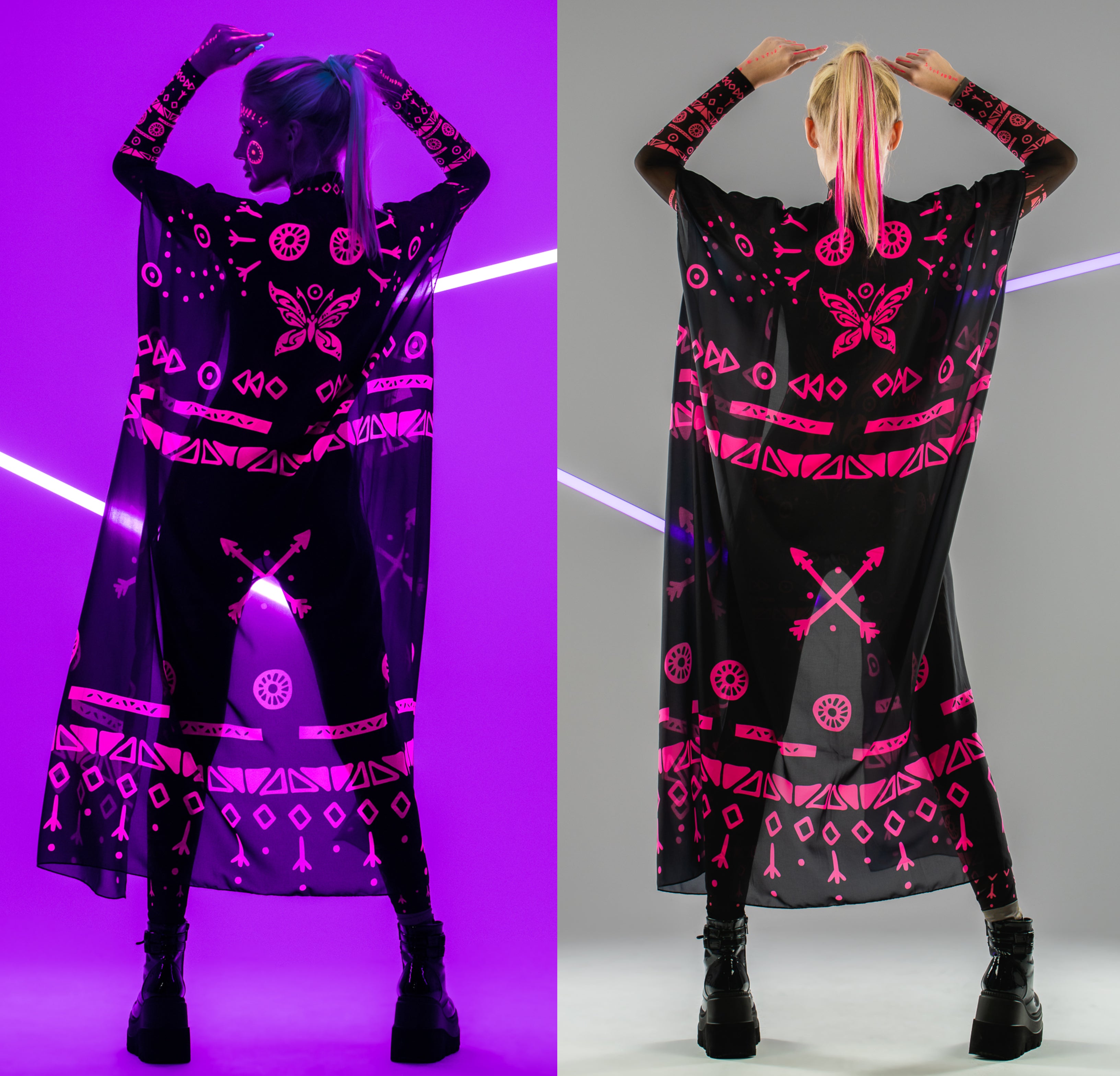 Light, flowy, and impossible to ignore – this UV-reactive kimono is your go-to for bold, glowing looks that stand out in any crowd. Crafted from ultra-soft chiffon and finished with a vivid fluorescent print, it's the perfect layering piece for parties, festivals, or performances.