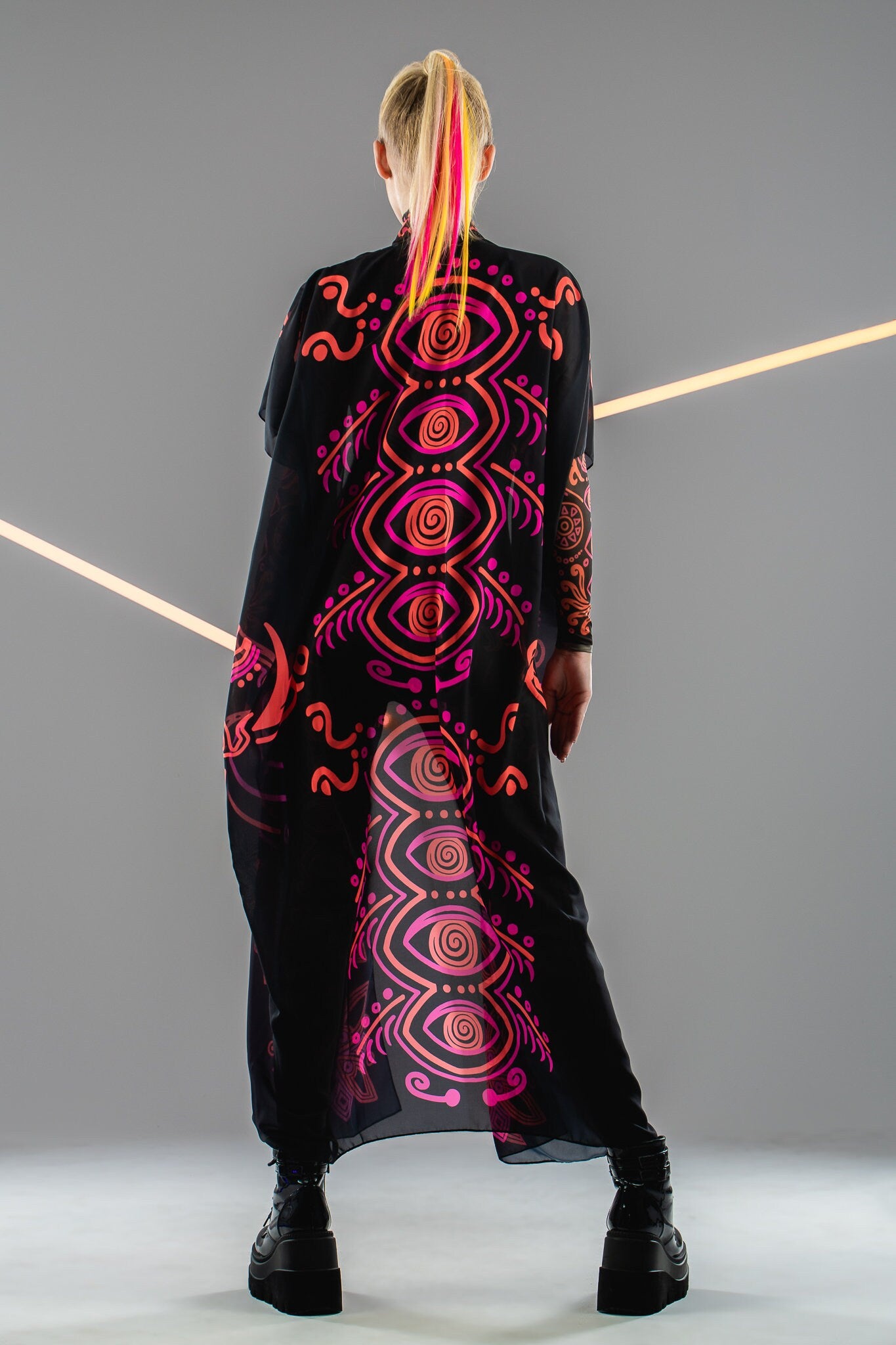 Light, flowy, and impossible to ignore – this UV-reactive kimono is your go-to for bold, glowing looks that stand out in any crowd. Crafted from ultra-soft chiffon and finished with a vivid fluorescent print, it's the perfect layering piece for parties, festivals, or performances.