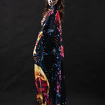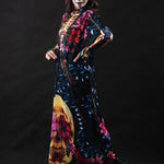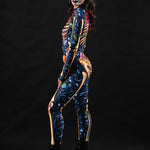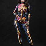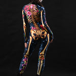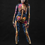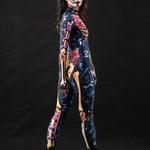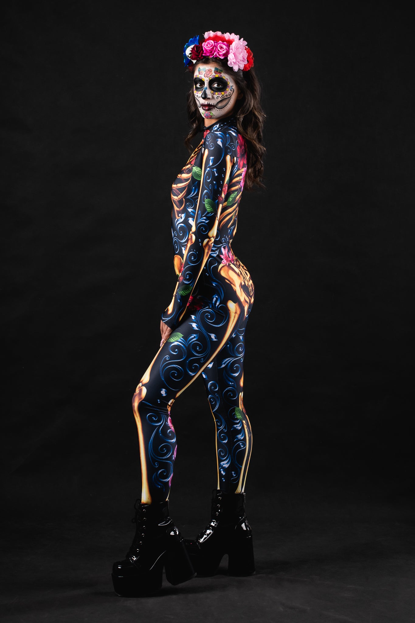 Want to stand out at your Halloween party? Our catsuit featuring a gold skeleton print with blue ornaments and flowers in warm red and pink tones is the perfect choice, blending unique design with unmatched comfort 🎃💖