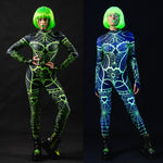 Woman wearing the Green Neon Spiderweb UV Reactive costume, a full-body suit with bright green spiderweb accents, perfect for Halloween parties or festivals.