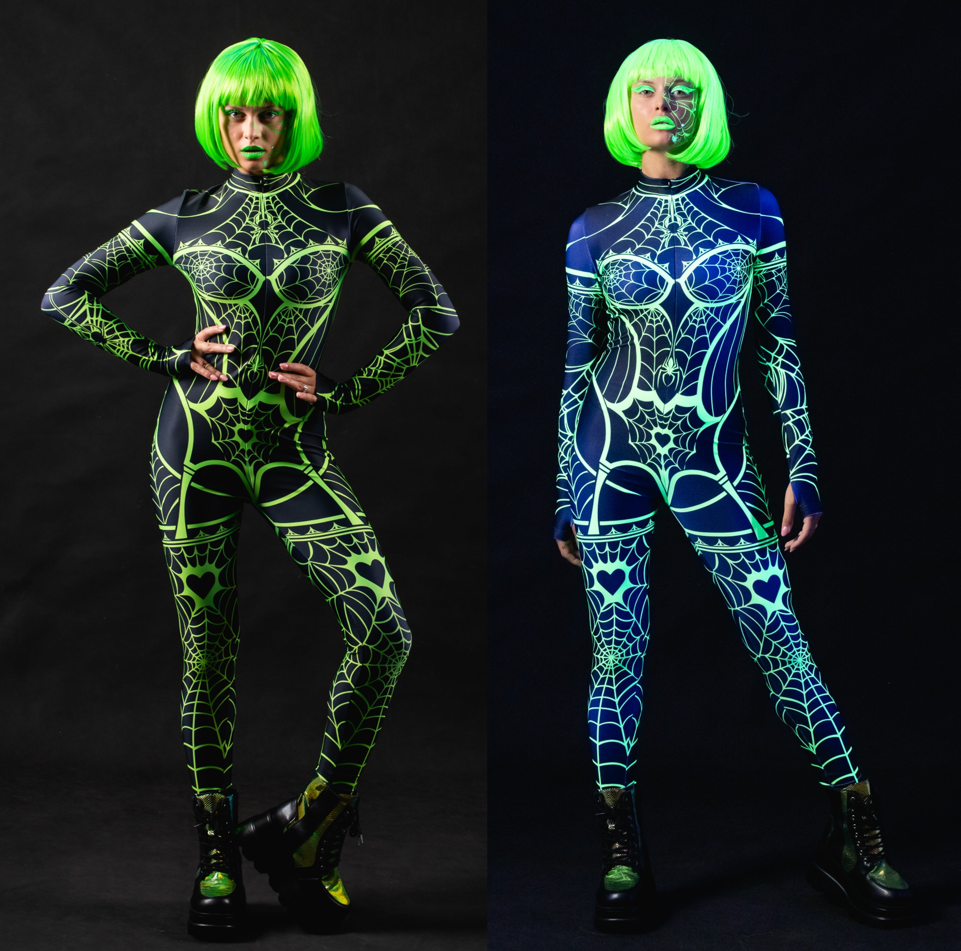 Want to captivate this Halloween? Our catsuit features a neon green fluorescent print, mimicking a sultry corset with stockings, enhanced with spiderwebs and spiders. It glows under UV light, creating a striking, eye-catching neon effect! 🕸️✨