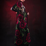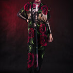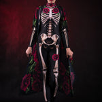 Women wearing a skeleton bodysuit with red rose. Kimono with roses. Styled for Halloween. The outfit is inspired by Day of the Dead.
