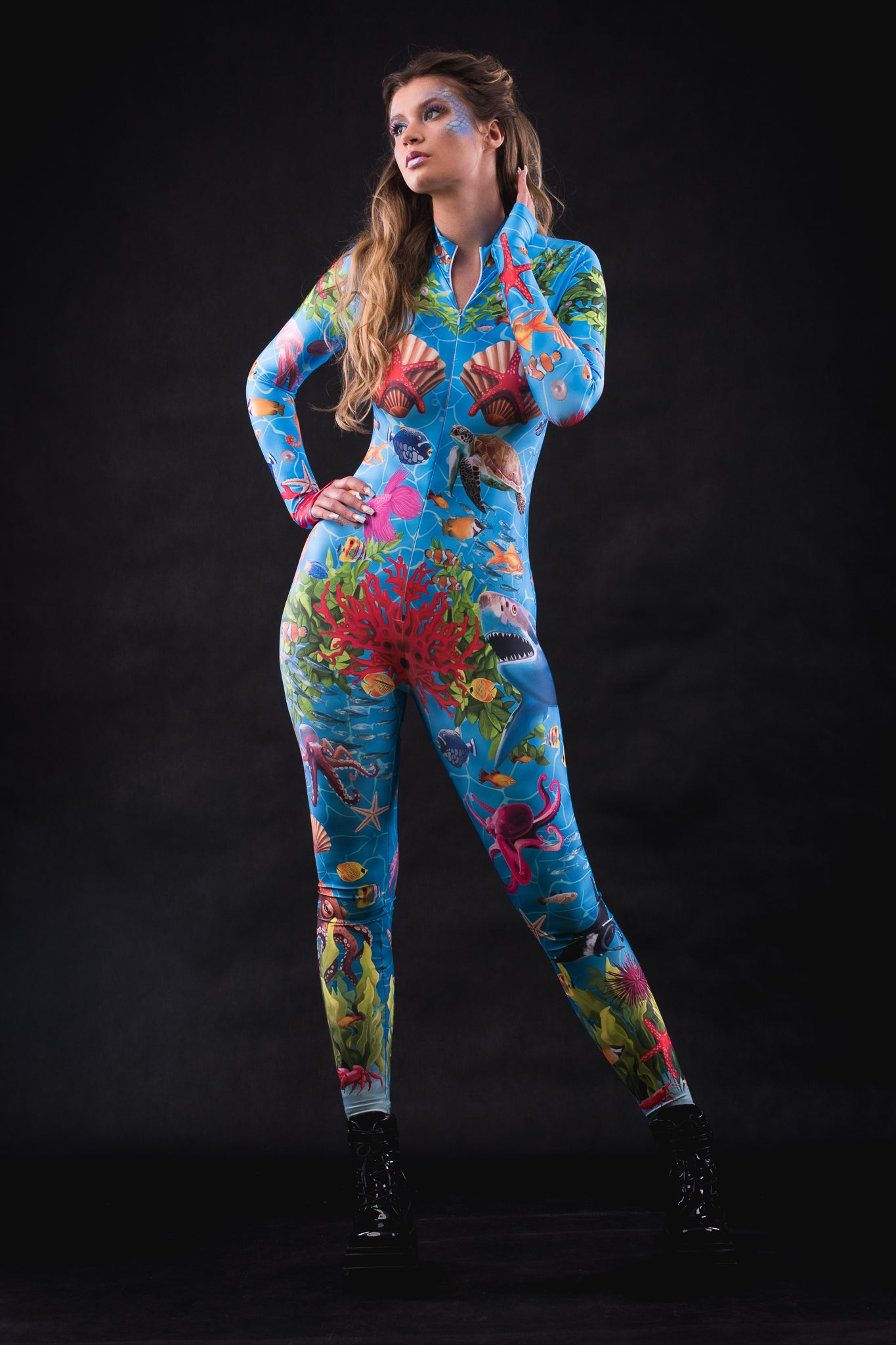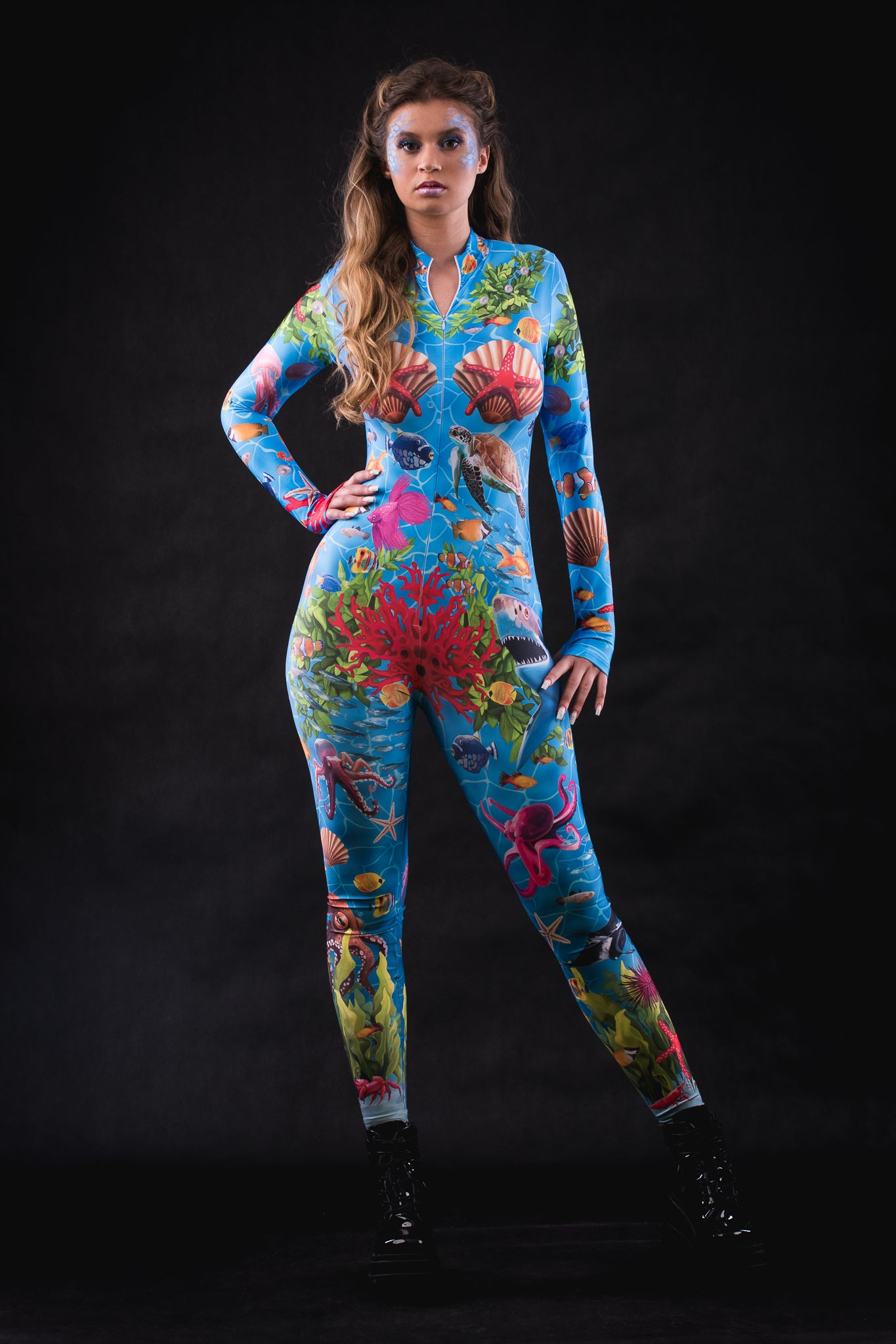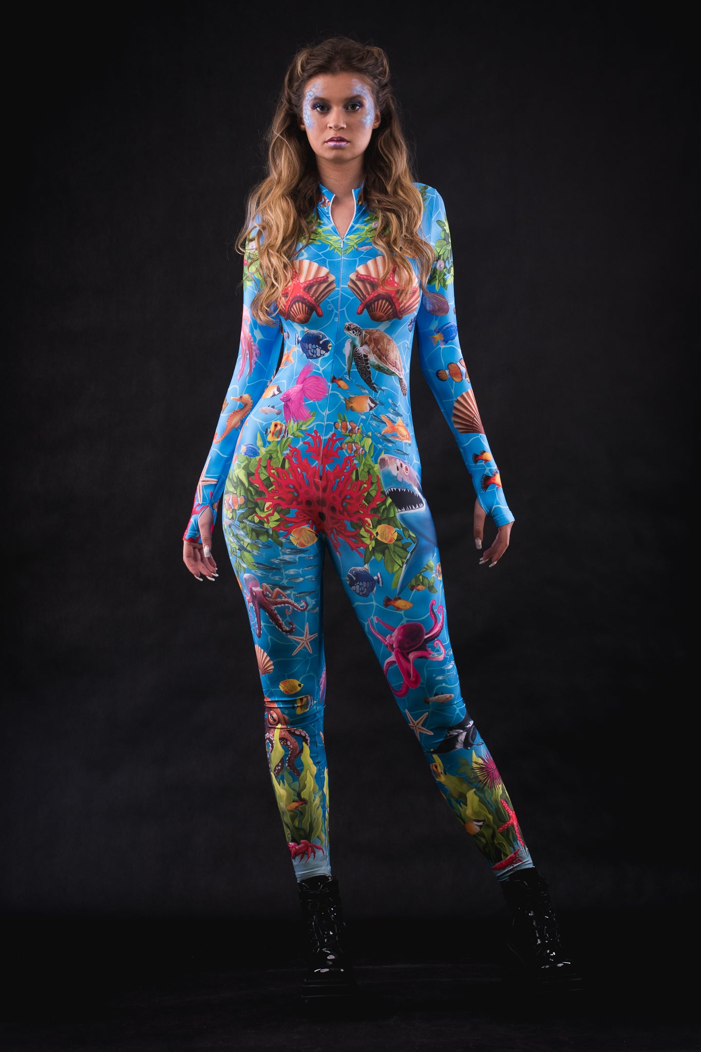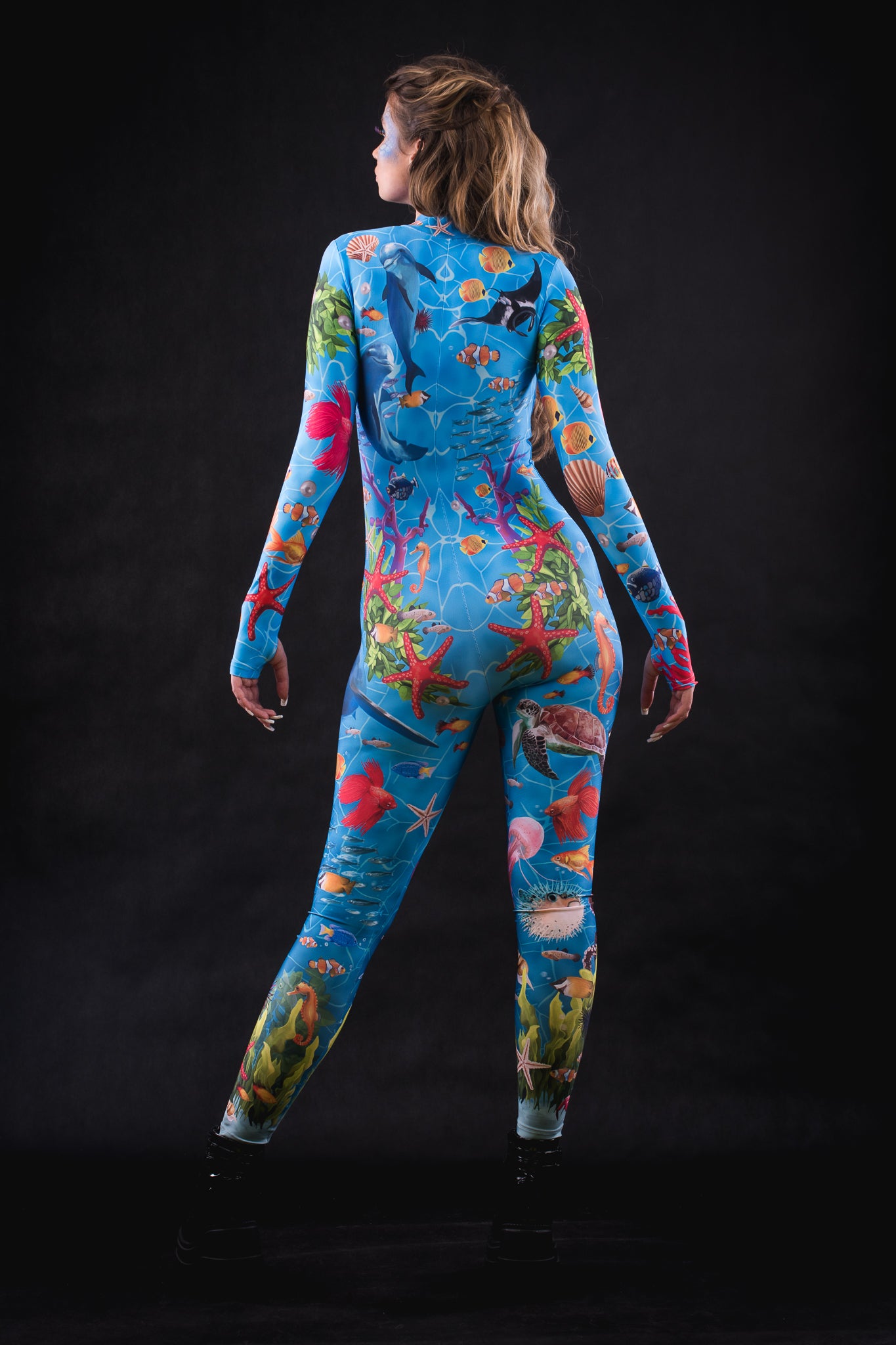 Feel like a mermaid from the depths with our underwater-inspired catsuit! The realistic design, featuring vibrant marine life, will ensure you stand out at any event. 🐠✨