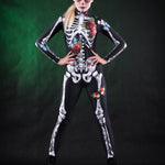Woman wearing the Roses Butterflies Skeleton costume, featuring a full-body skeleton design with floral and butterfly accents, perfect for Halloween parties or Day of the Dead events.
