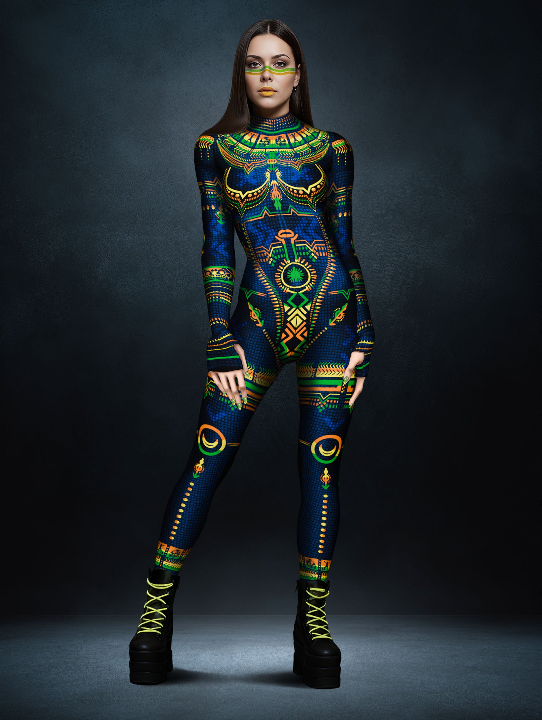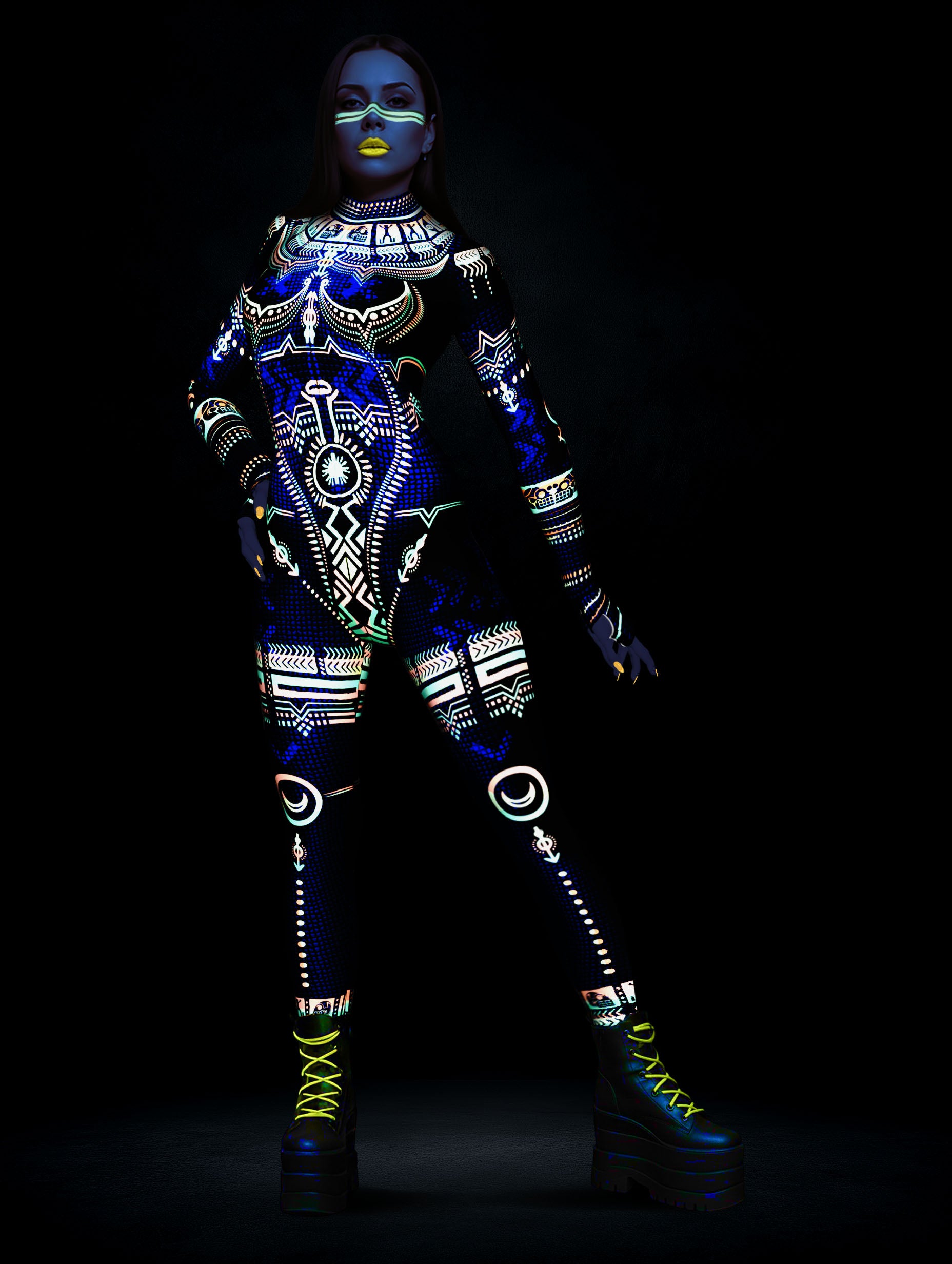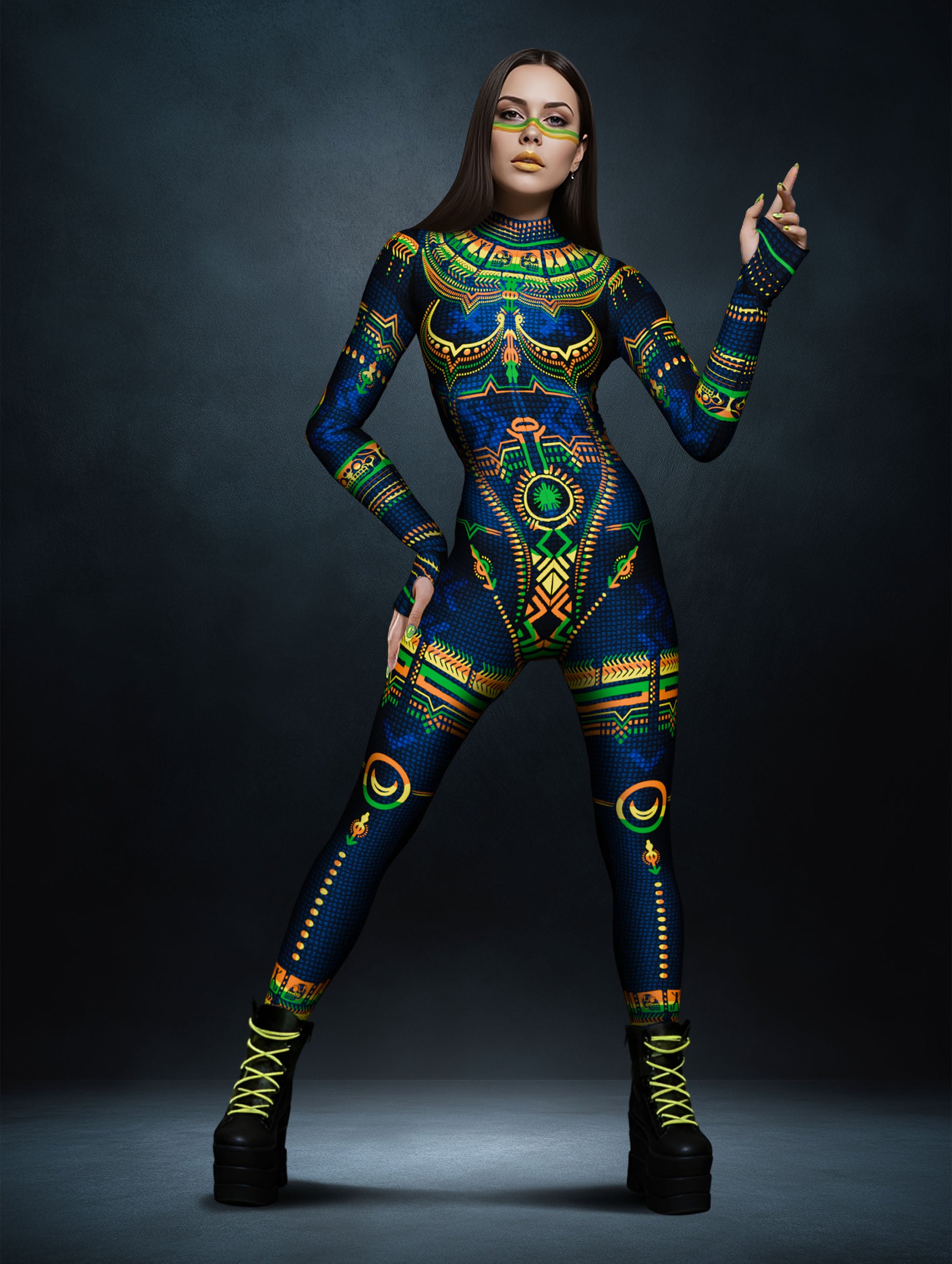 AZTEC TRIBAL UV Reactive Catsuit - Full Body Festival Costume for Women