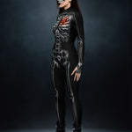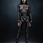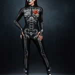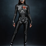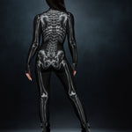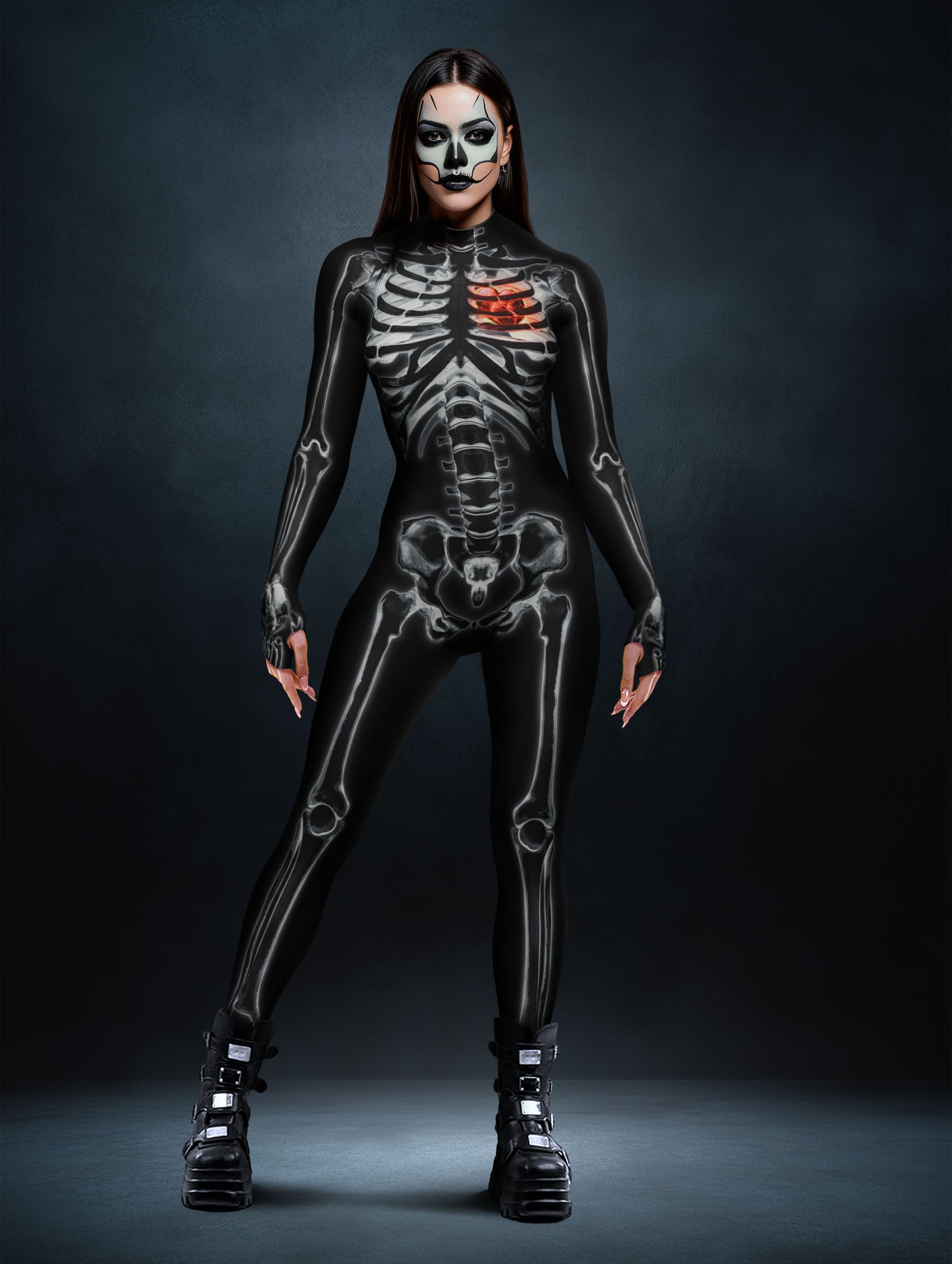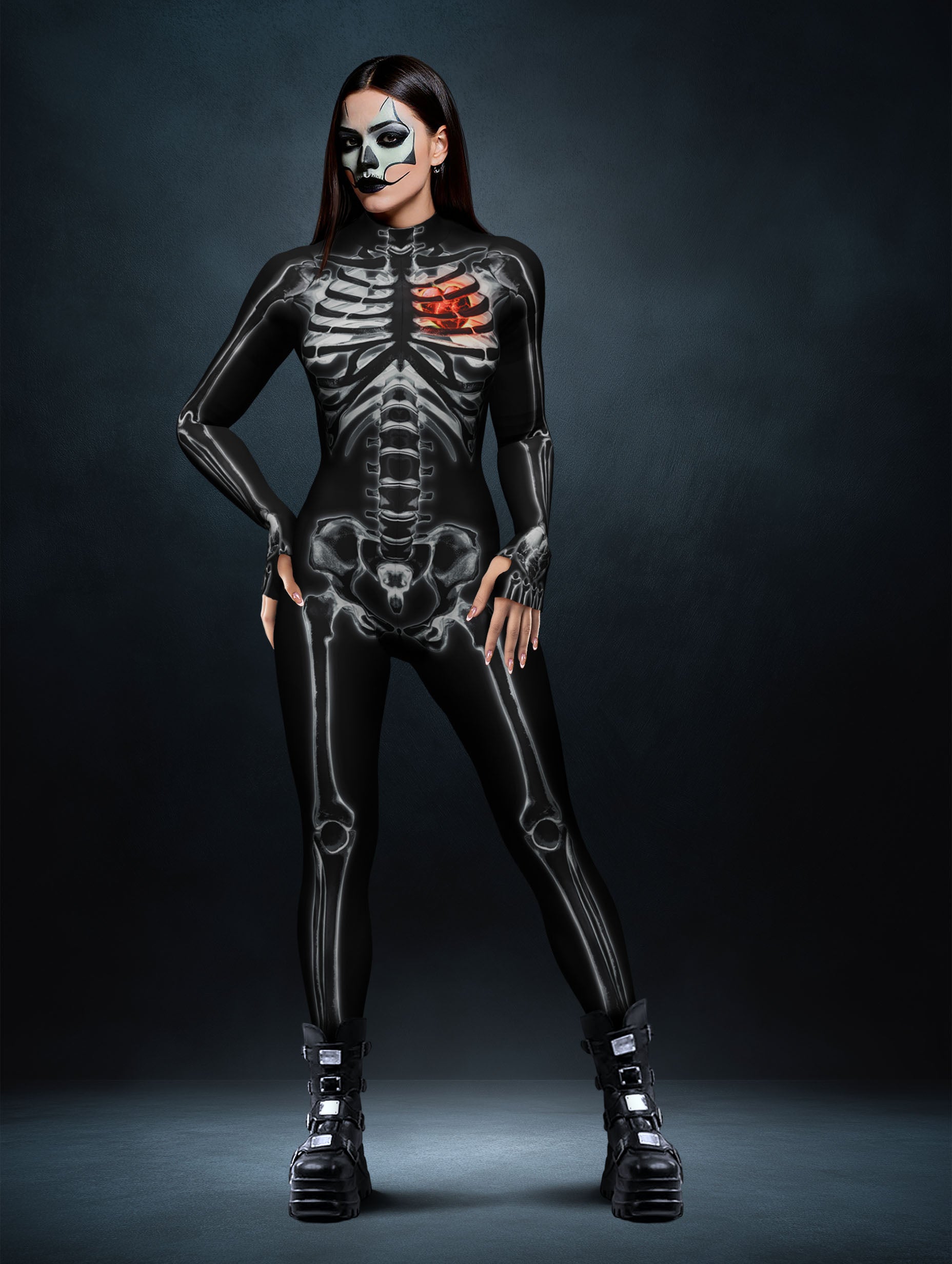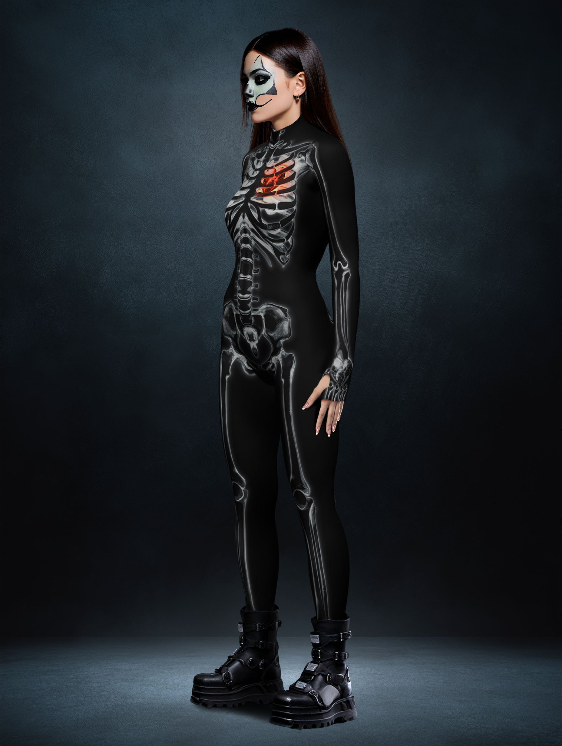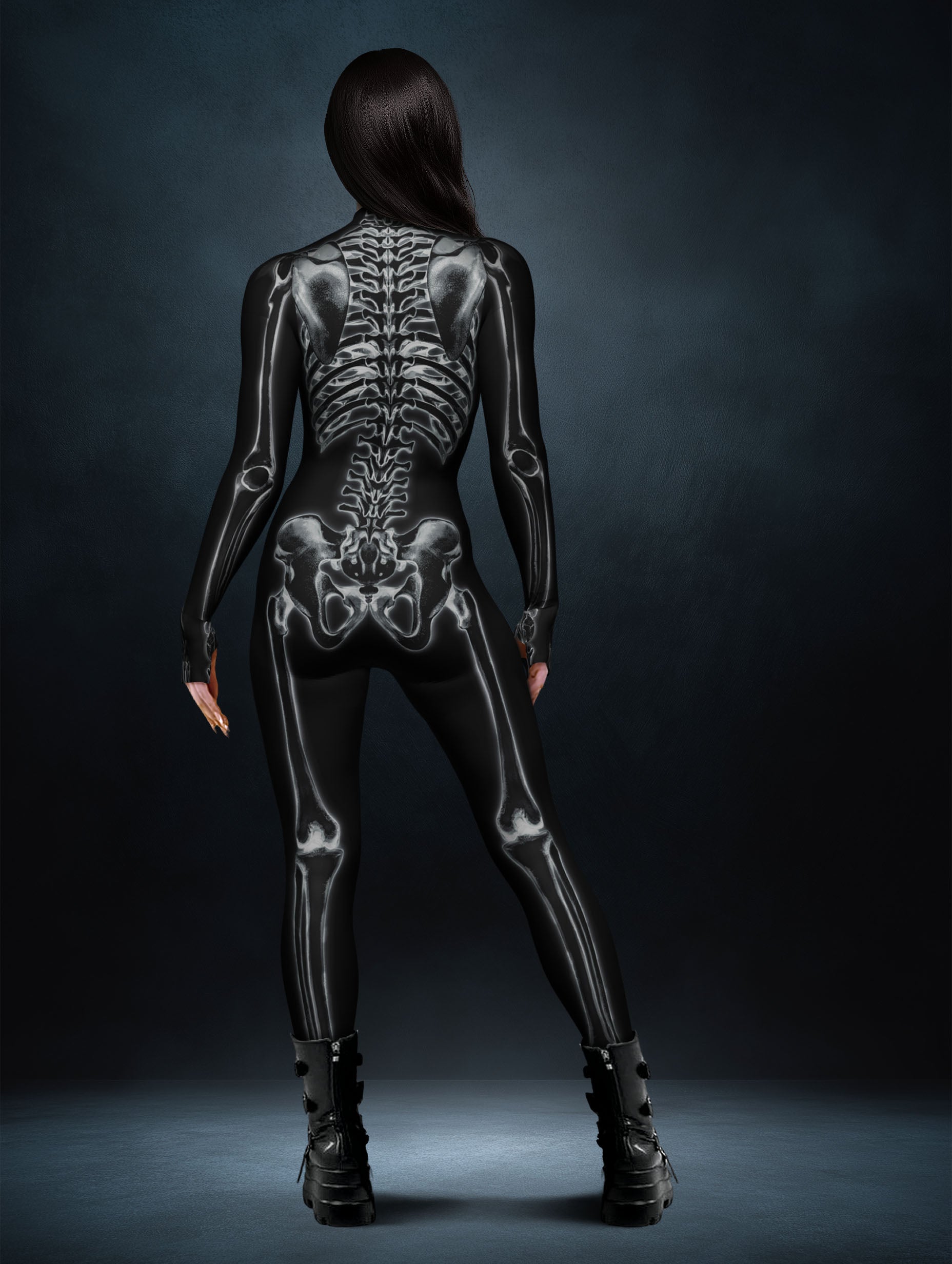 Want to impress at your Halloween party? Our catsuit with a black skeleton motif is the perfect choice! 🎃✨