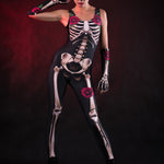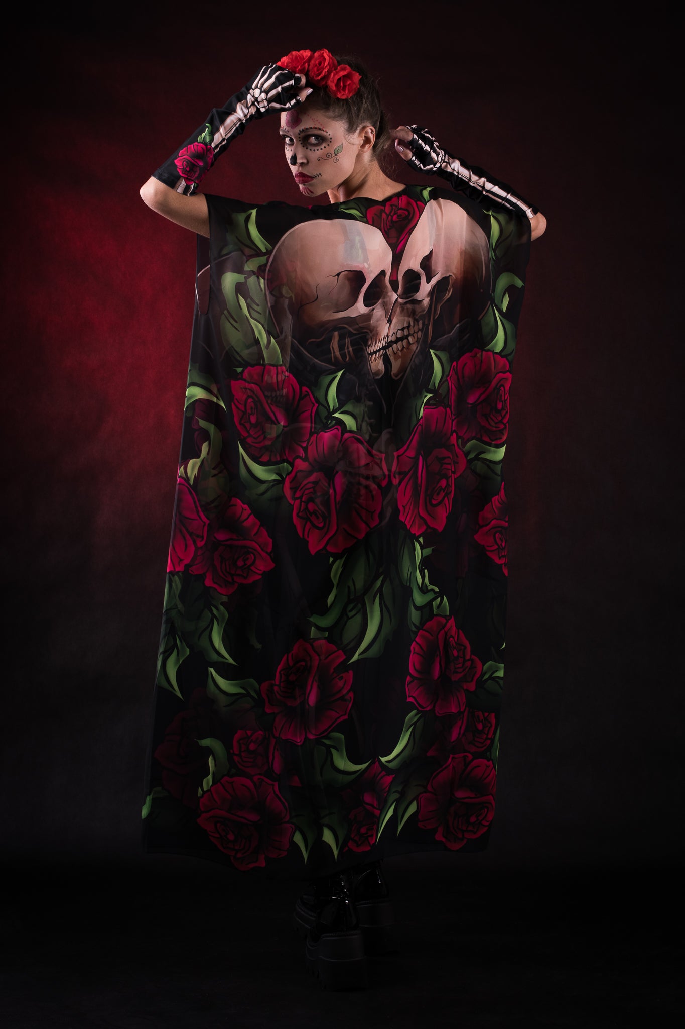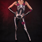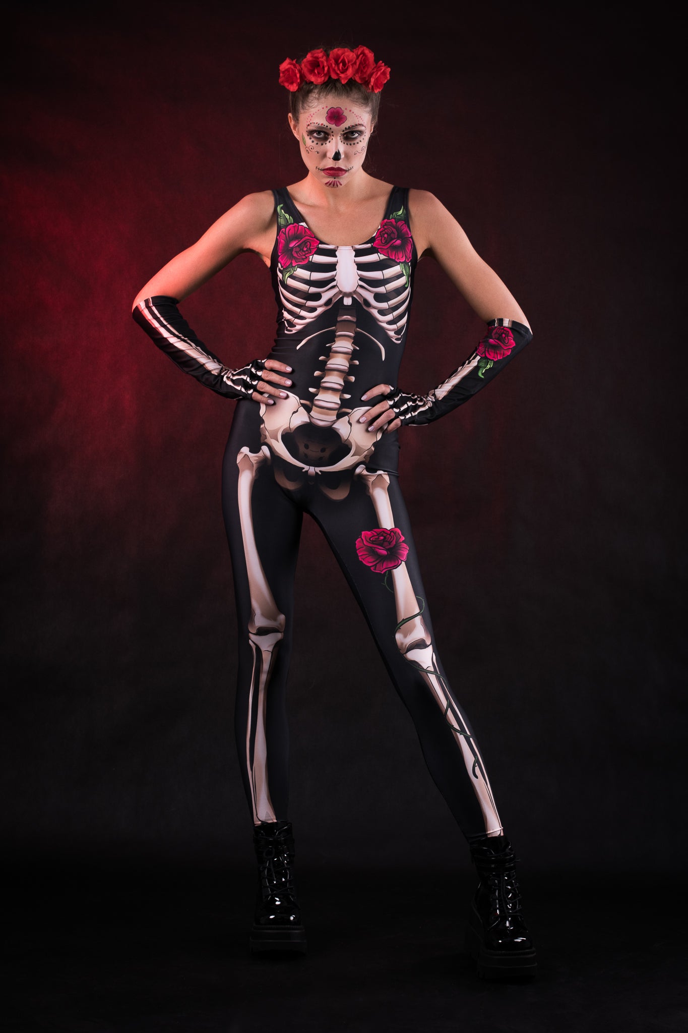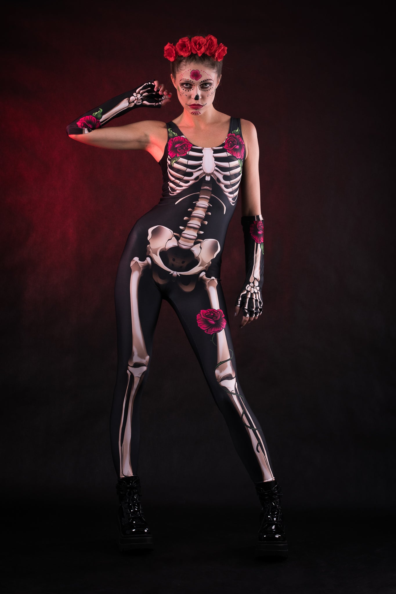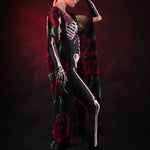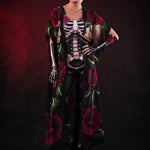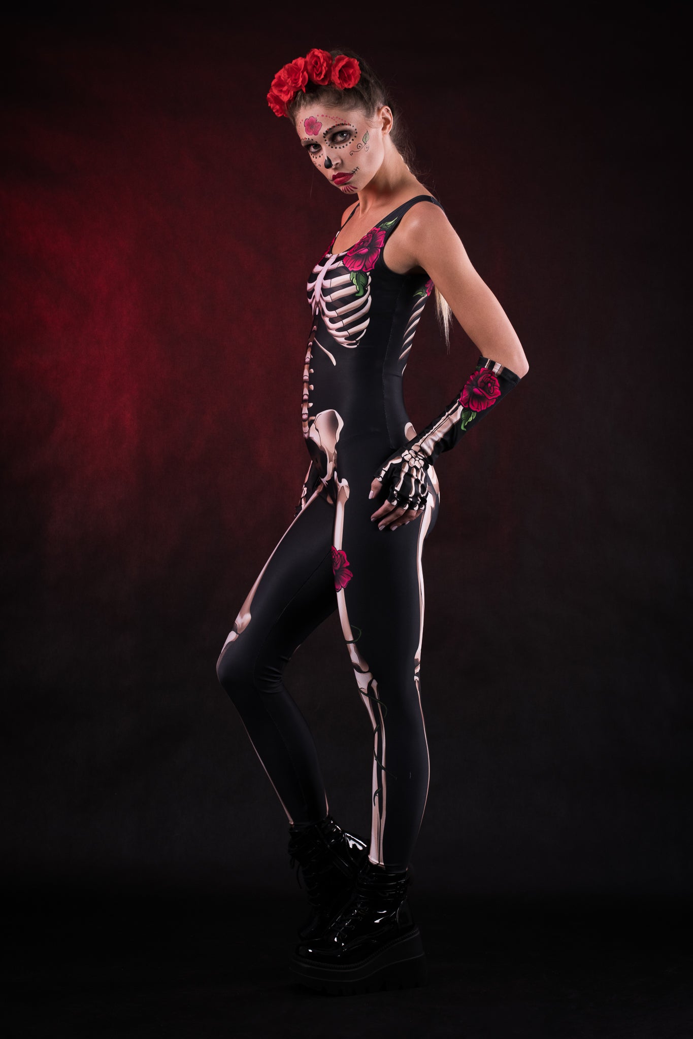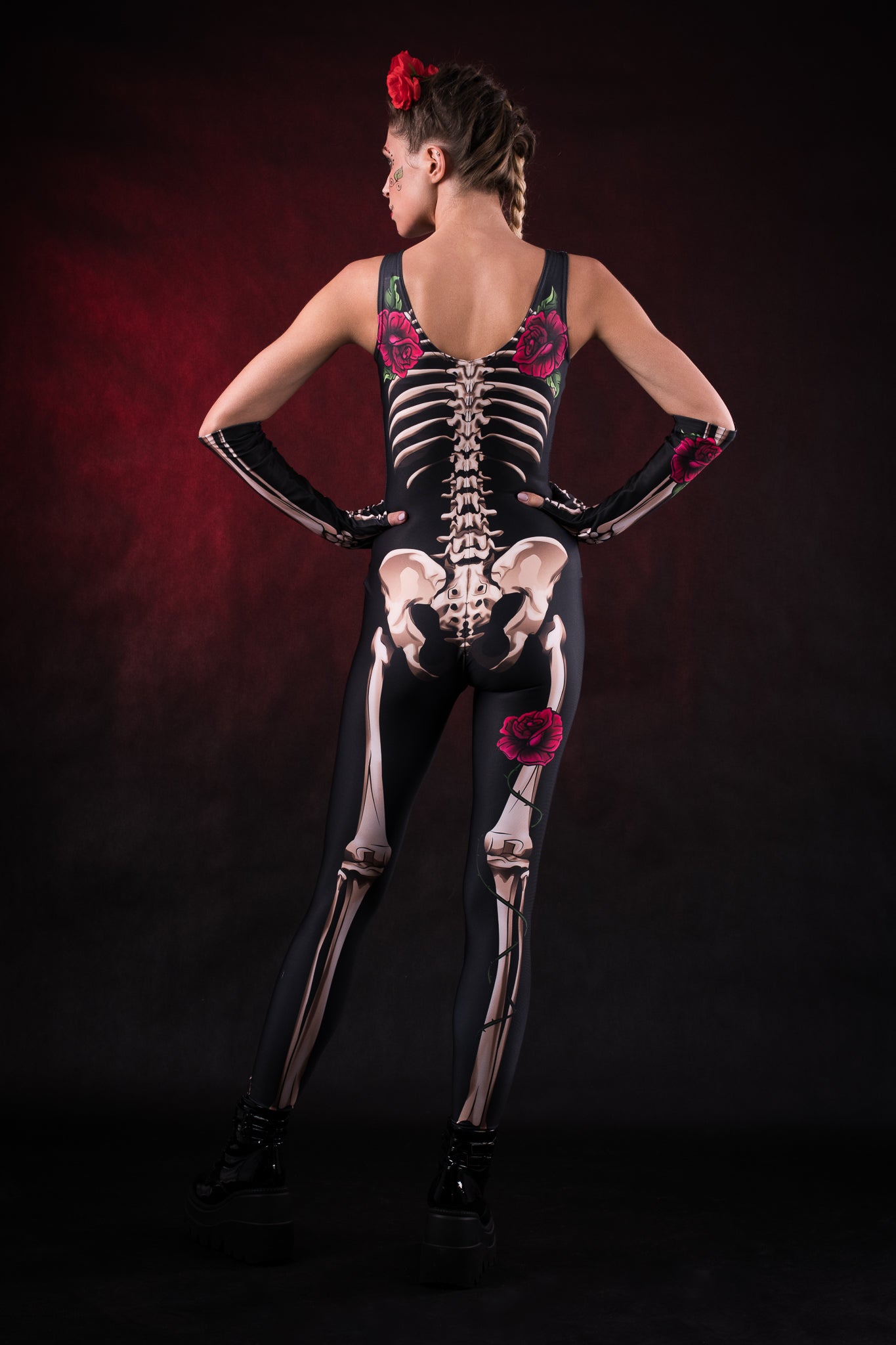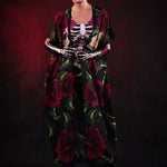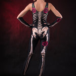 Looking for a unique and comfortable outfit for Halloween or other themed parties? Our scoop neck jumpsuit and gloves set, featuring a bold skeleton and red roses print, is the perfect choice to help you stand out from the crowd!🎃✨