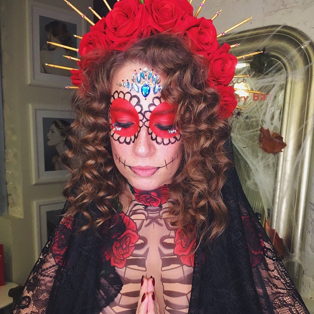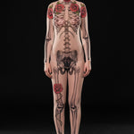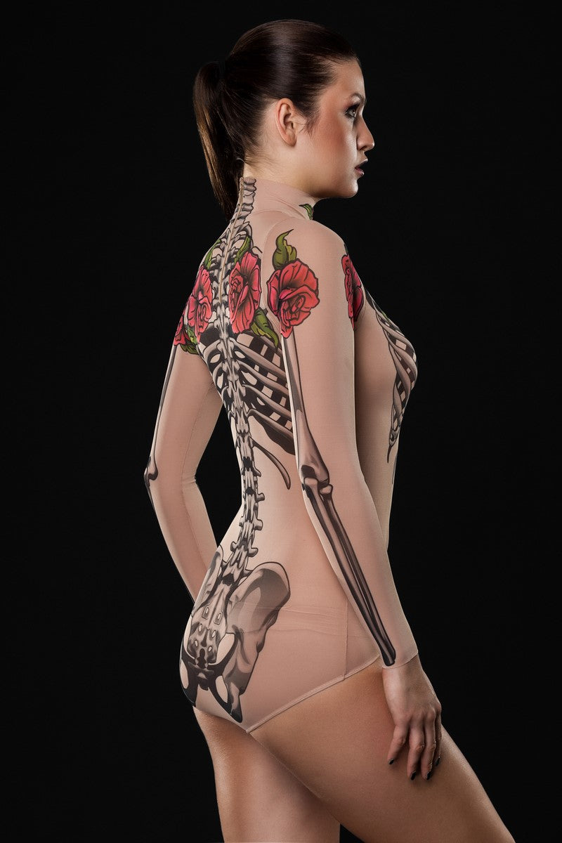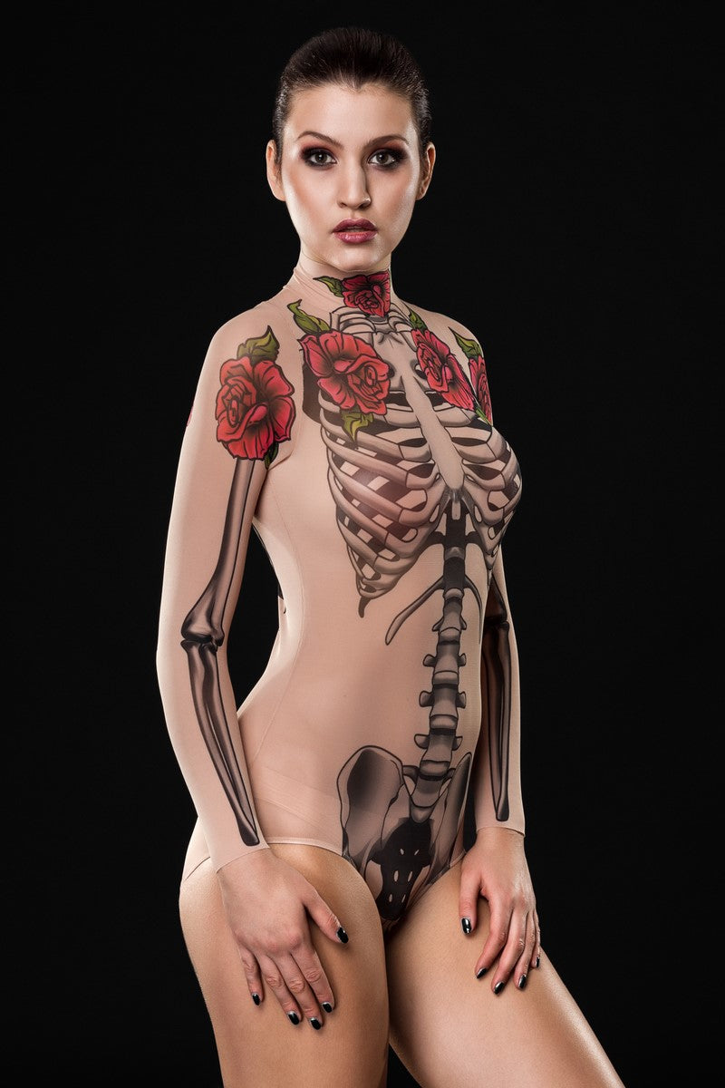 A bold blend of spooky and sultry – this tattoo-effect bodysuit mixes skeleton bones with blooming red roses for a look that's hauntingly beautiful. 🕯️